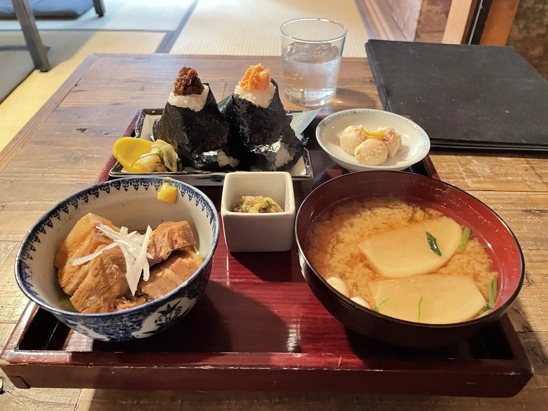 おにぎり2個、主菜、小鉢2種、汁物、漬物、お茶、お茶菓子がセットの定食。おにぎりは10種類以上の中から2つ、主菜は2種類の中から1つ選べます。定番の種類もありますが、それぞれの内容は時期によって変わります。