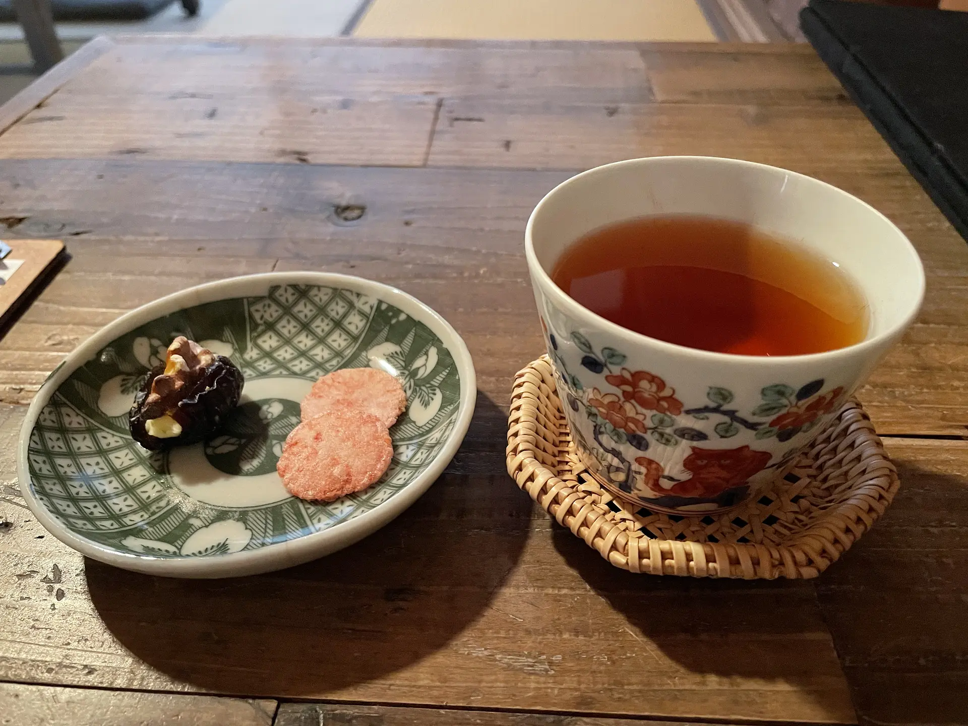お茶は、本日の煎茶、焙じ茶、和紅茶の中から一つを選びます。私が個人的におすすめしたいのは和紅茶!この和紅茶は「やぶきた」という品種で、渋みのない飲みやすさが特徴です。
