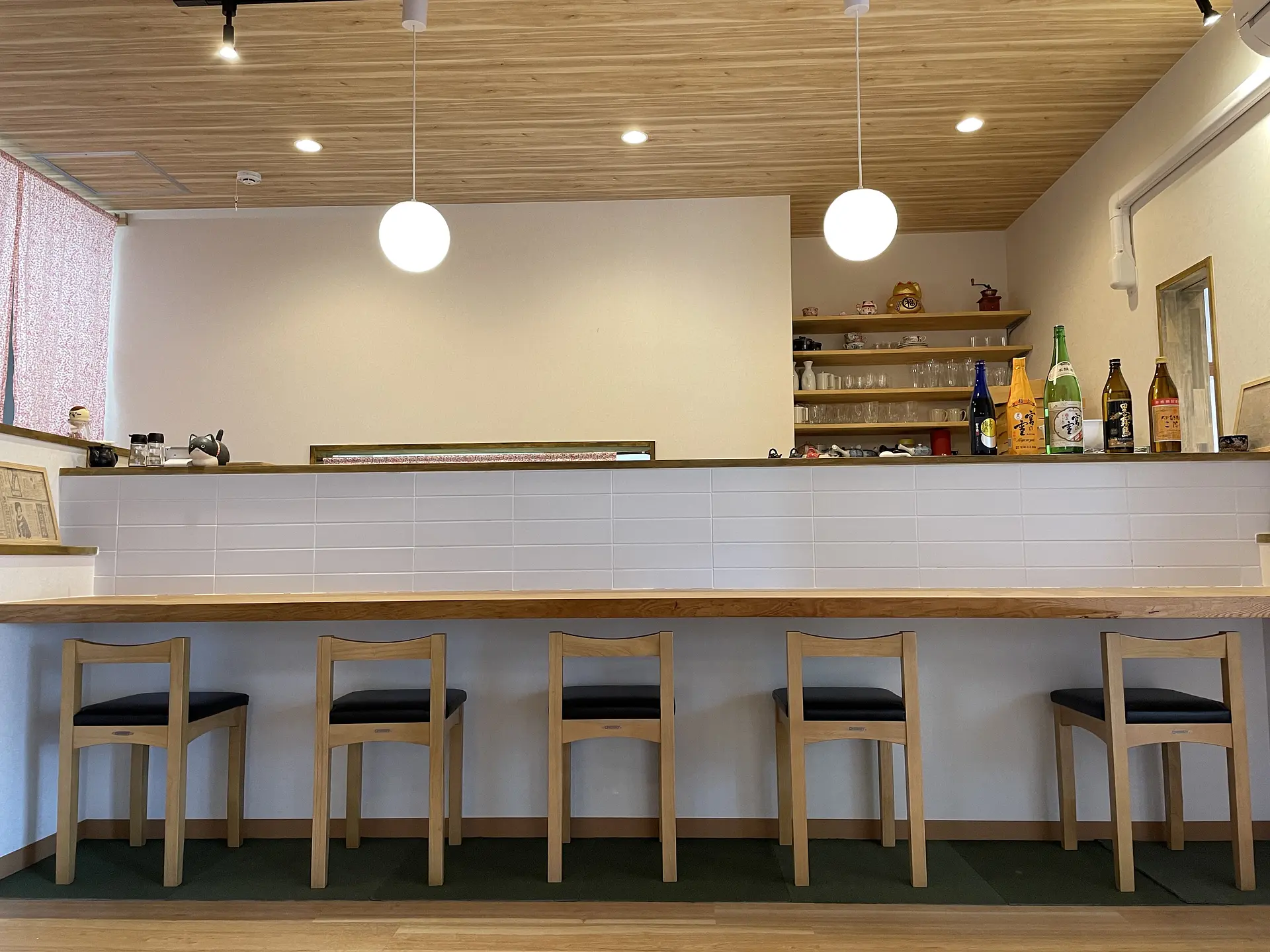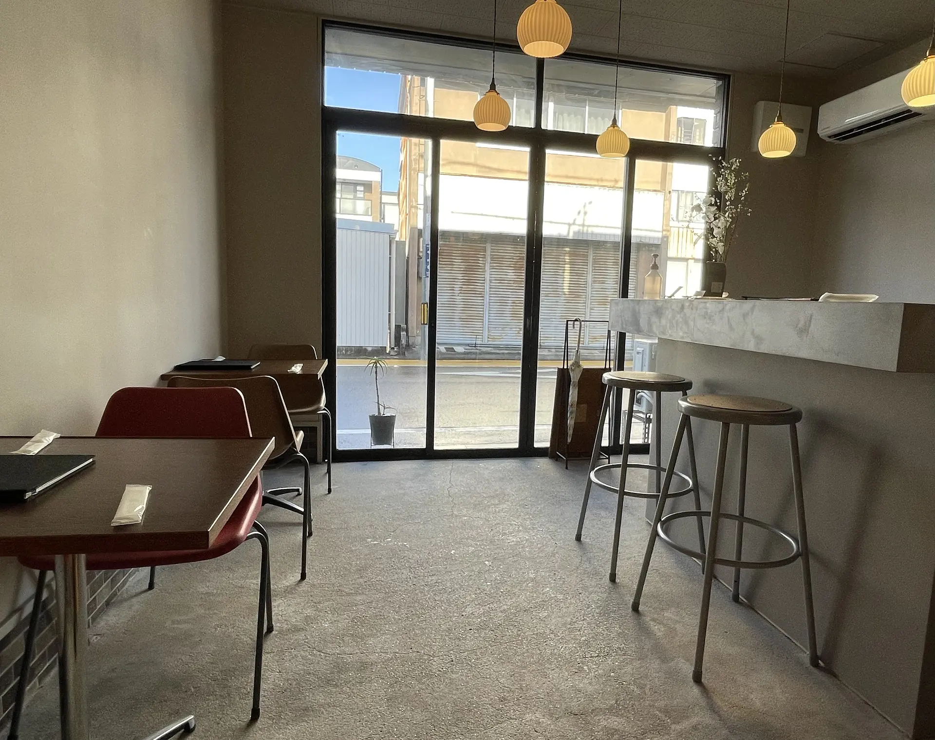 入り口側の店内は、モダンシックなスペースに改装されていて、4名掛けのカウンター席と2名掛けのテーブル席が2つあり、とてもスタイリッシュな空間です。