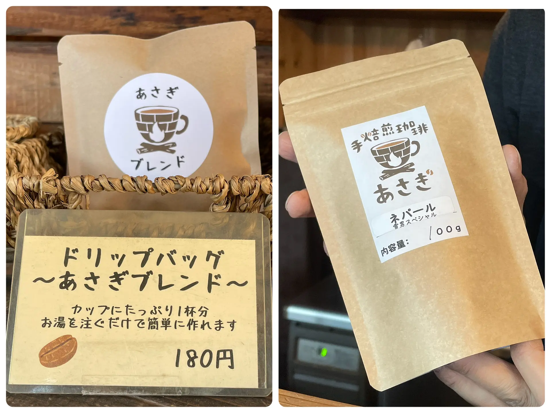 手焙煎珈琲 あさぎでは、焙煎したコーヒー豆やドリップバッグも販売しています。本格的なコーヒーをお家でも楽しめるのは嬉しいですね。パッケージも素敵です。