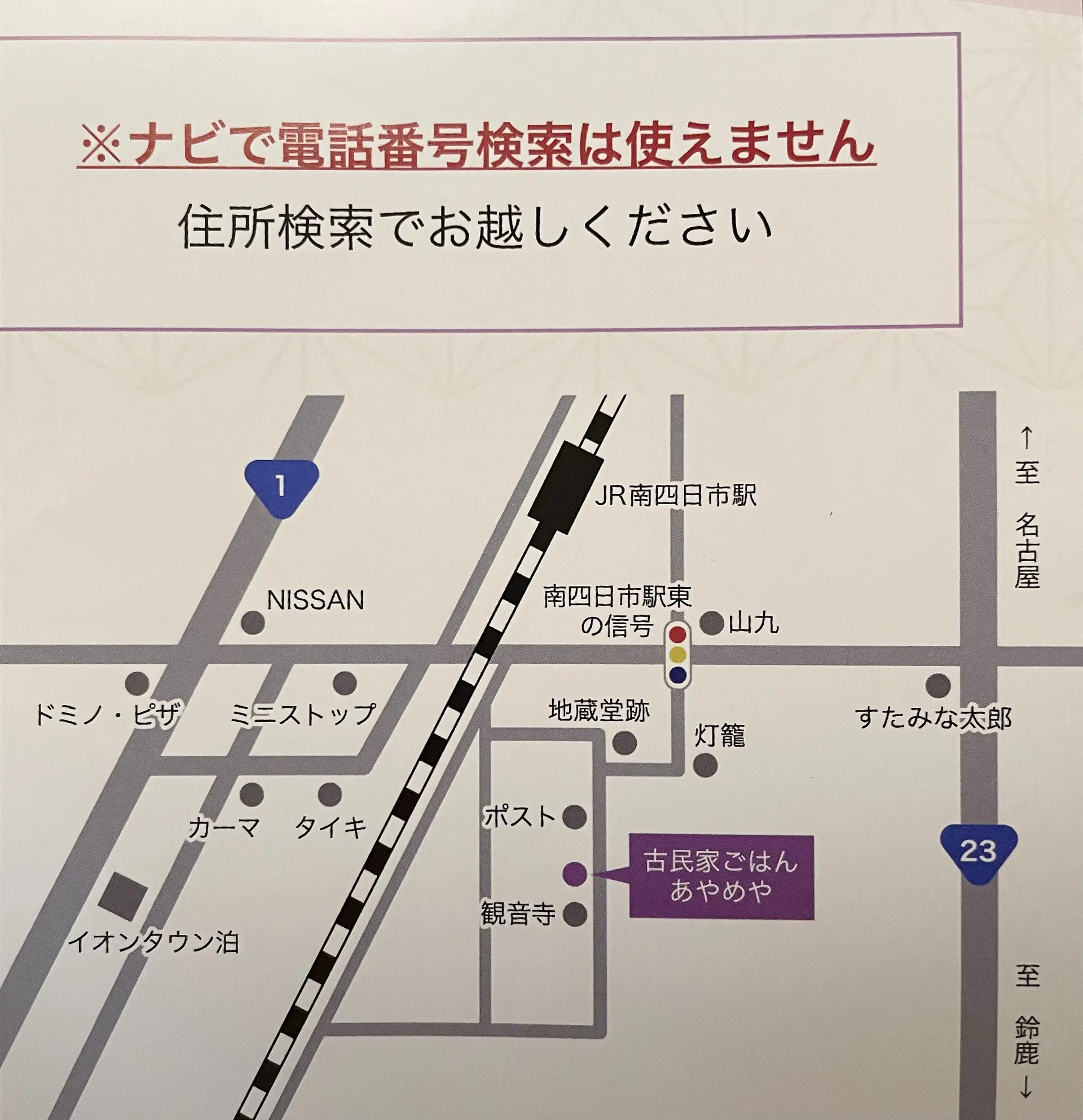 ※店周辺は住宅街で道が狭くなっています。特に店舗の南側の道はかなり狭いため、車でお越しの際は写真の地図を参考に、JR南四日市駅方面からお越しください。