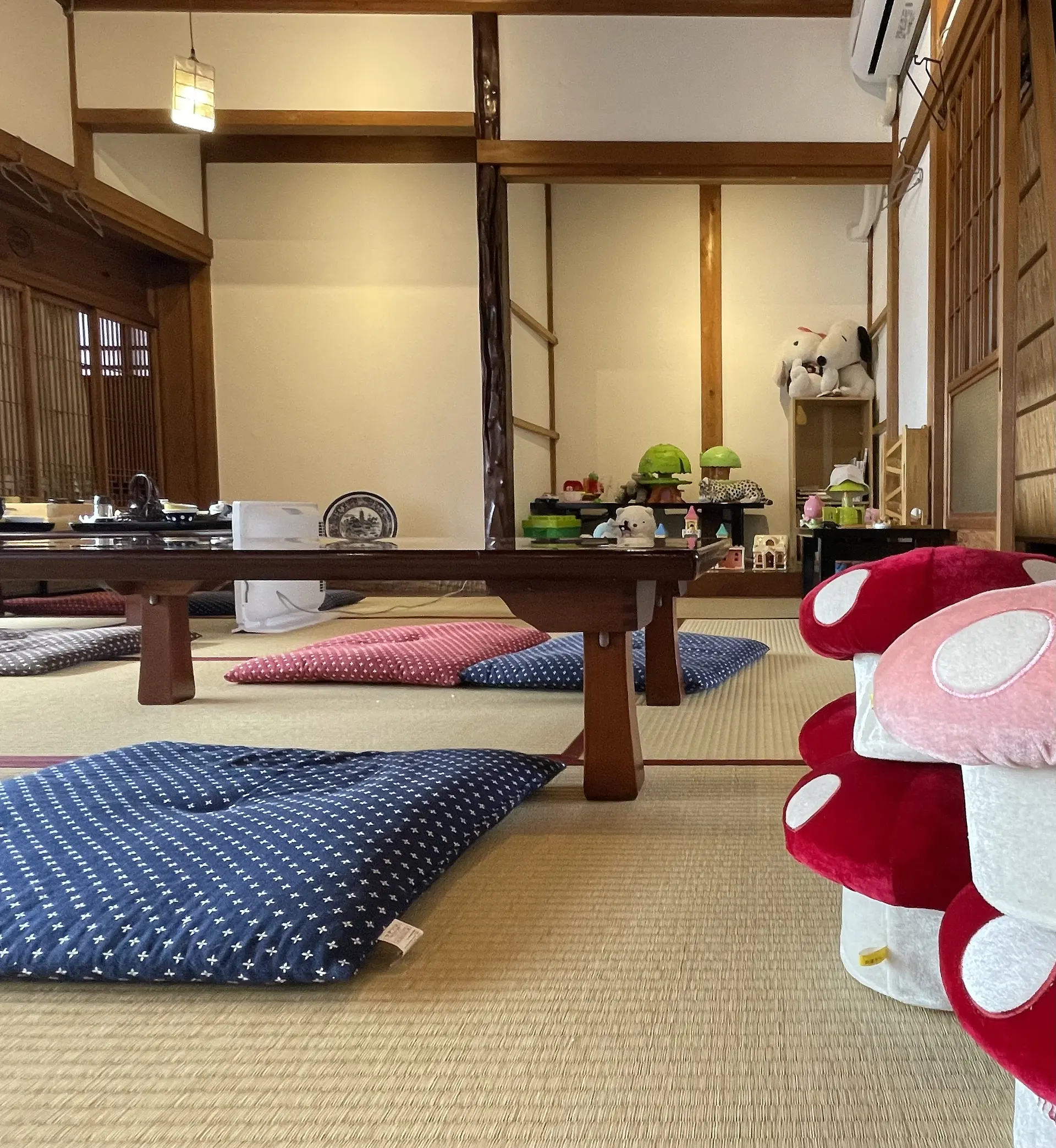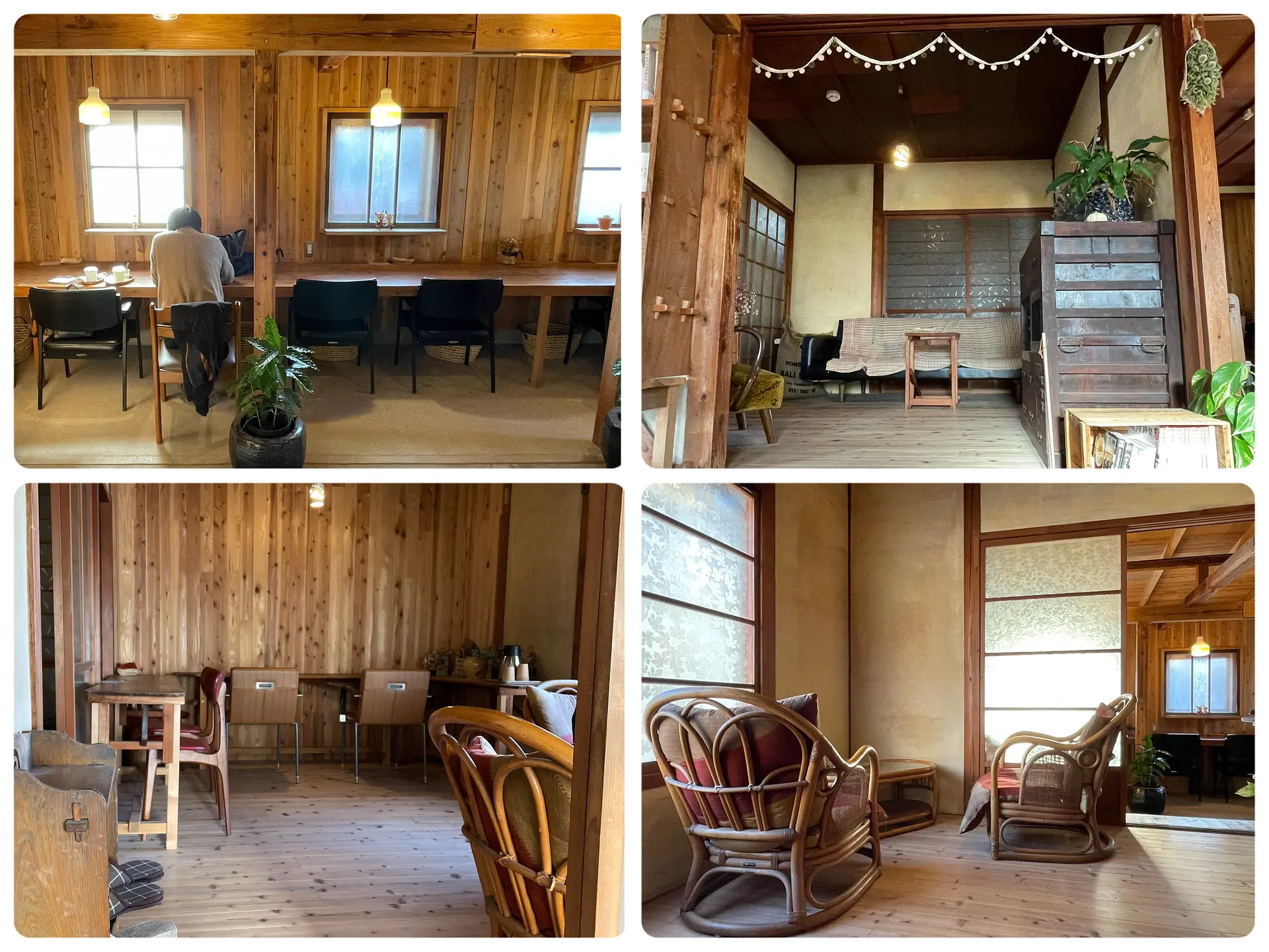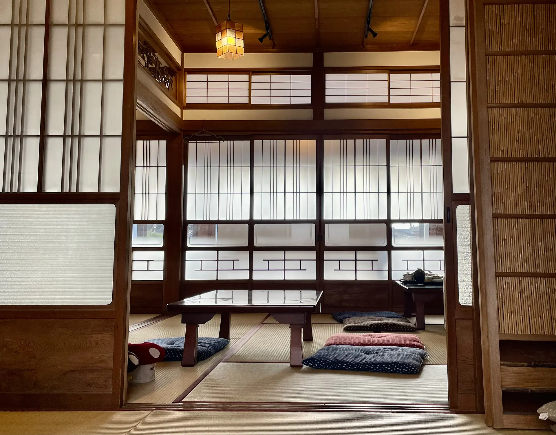靴を脱いで奥へ進むと、古民家の面影を残す和室が。2名掛けと4名掛けのテーブル席が2つあります。
