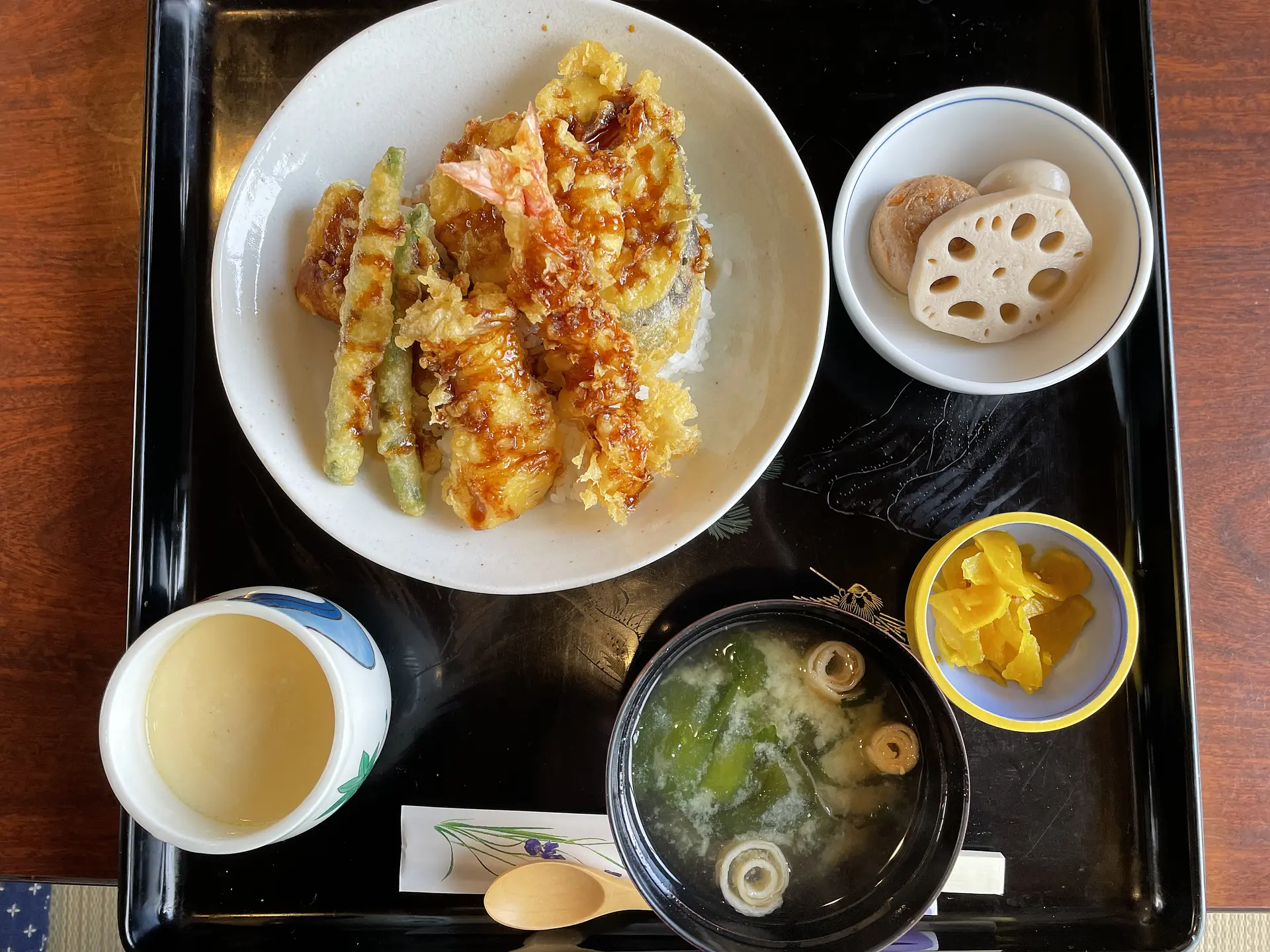 あやめやのえび天丼は、大きな海老以外にも、茄子やカボチャなどの野菜類の天ぷらも乗っています。衣はサクサクで、中の具材の旨みが引き立っていました。色々な具材があるので、飽きることなく最後まで美味しく頂けます。お味噌汁、小鉢、茶碗蒸しも美味しかったです!