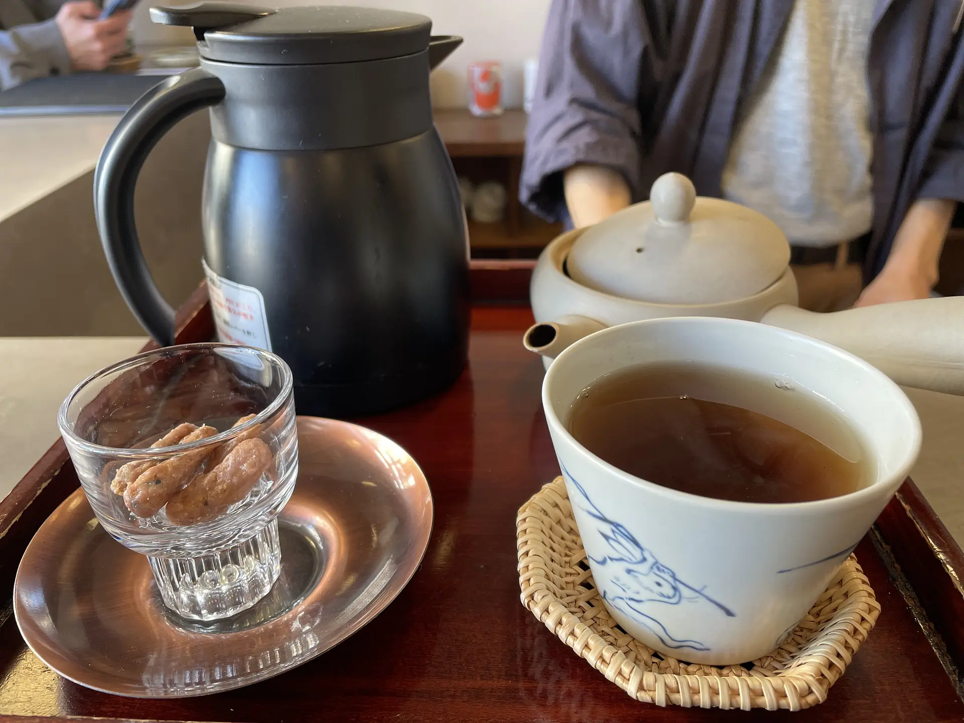 お茶には一口茶菓子が付き、四日市の萬古焼(ばんこやき)の急須とお湯も一緒に出して頂けます。一煎目はお店の方が淹れてくれます。一煎目は香ばしく、二煎目以降はさっぱりとした味わい。