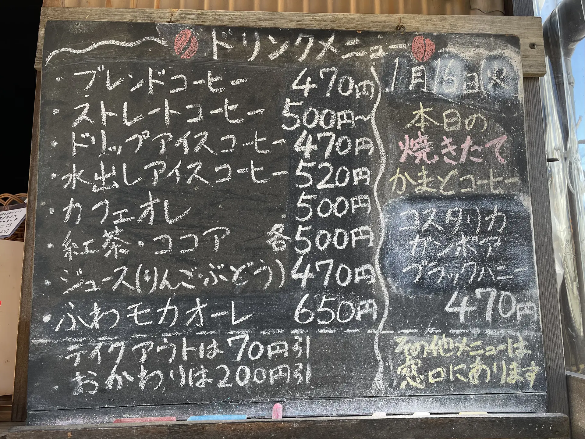 飲み物のメニューはまず黒板を見て選びましょう。産地別コーヒーの種類も豊富で、そのメニューは窓口の手元に置かれています。