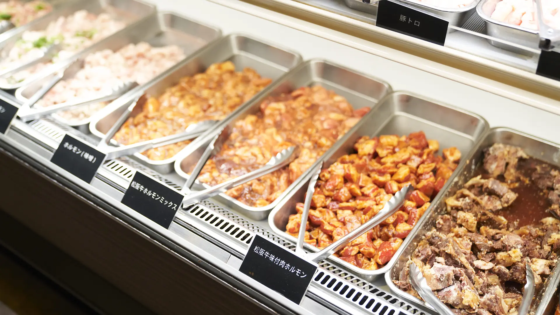 国産牛を中心に、松阪牛のホルモンや、豚肉、鶏肉、野菜、フルーツ、惣菜、ドリンクなど、常時約40~50種類のメニューが食べ放題!