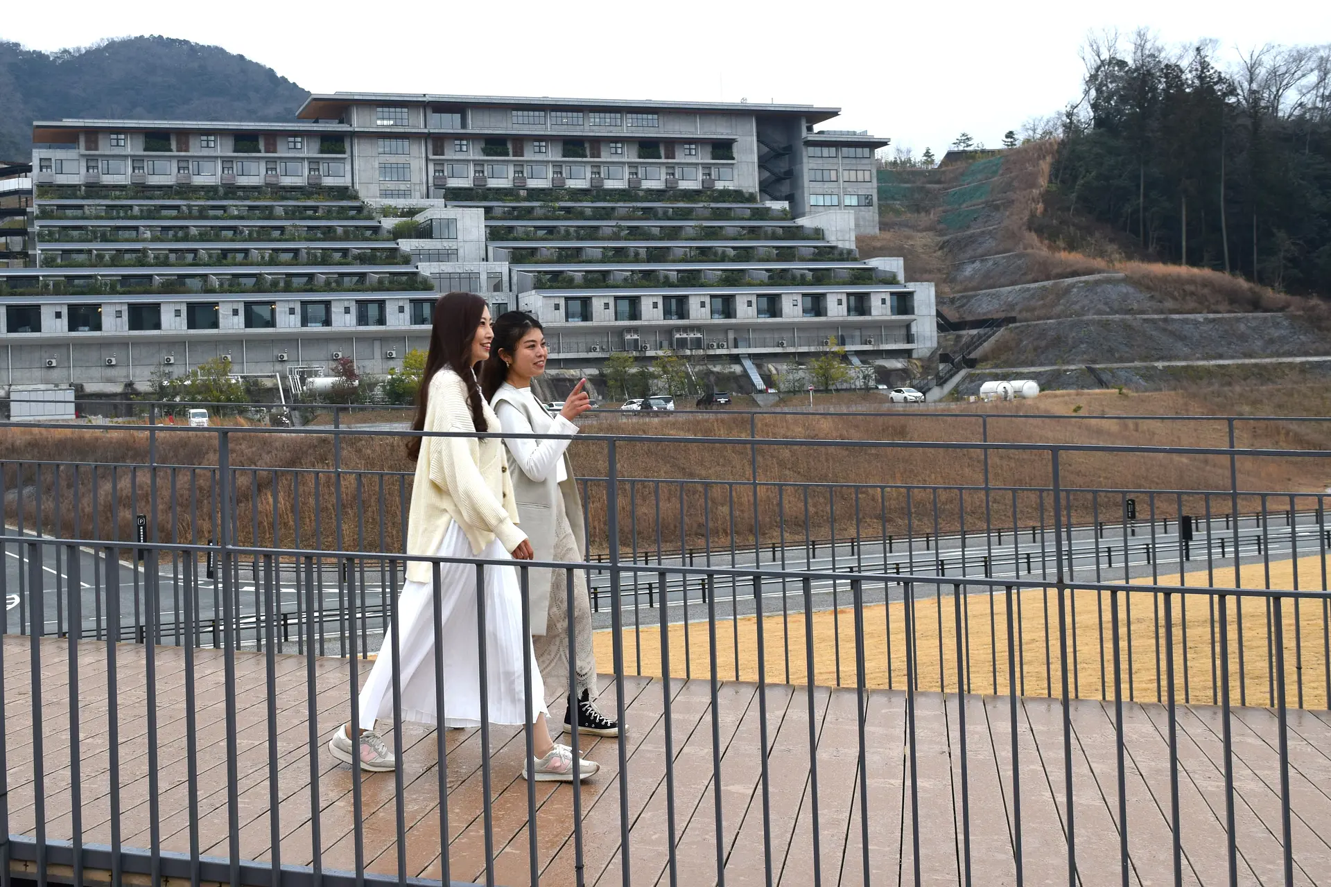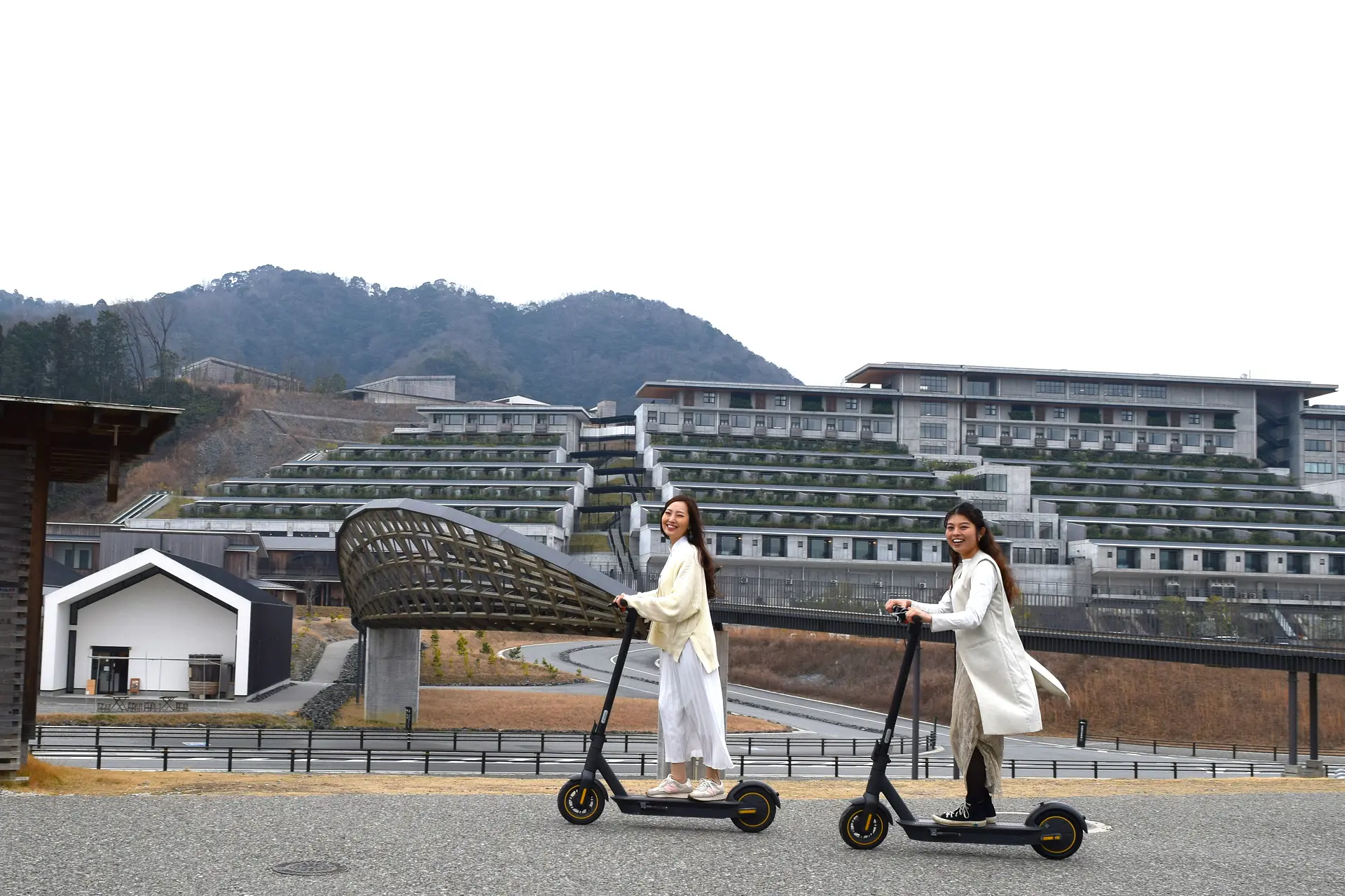 わたしも電動キックスクーターを初体験しました。ブレーキとアクセルについて教わり、ハンドルを握って数回地面をキック。ここからは手で操作します。登り坂でもスイスイ進み、快適で気持ちよかったですよ!遠くの山と広い空、夕日など…美しい景観も楽しみながら、オシャレなモビリティで広い敷地をかしこく周遊しちゃいましょう♪