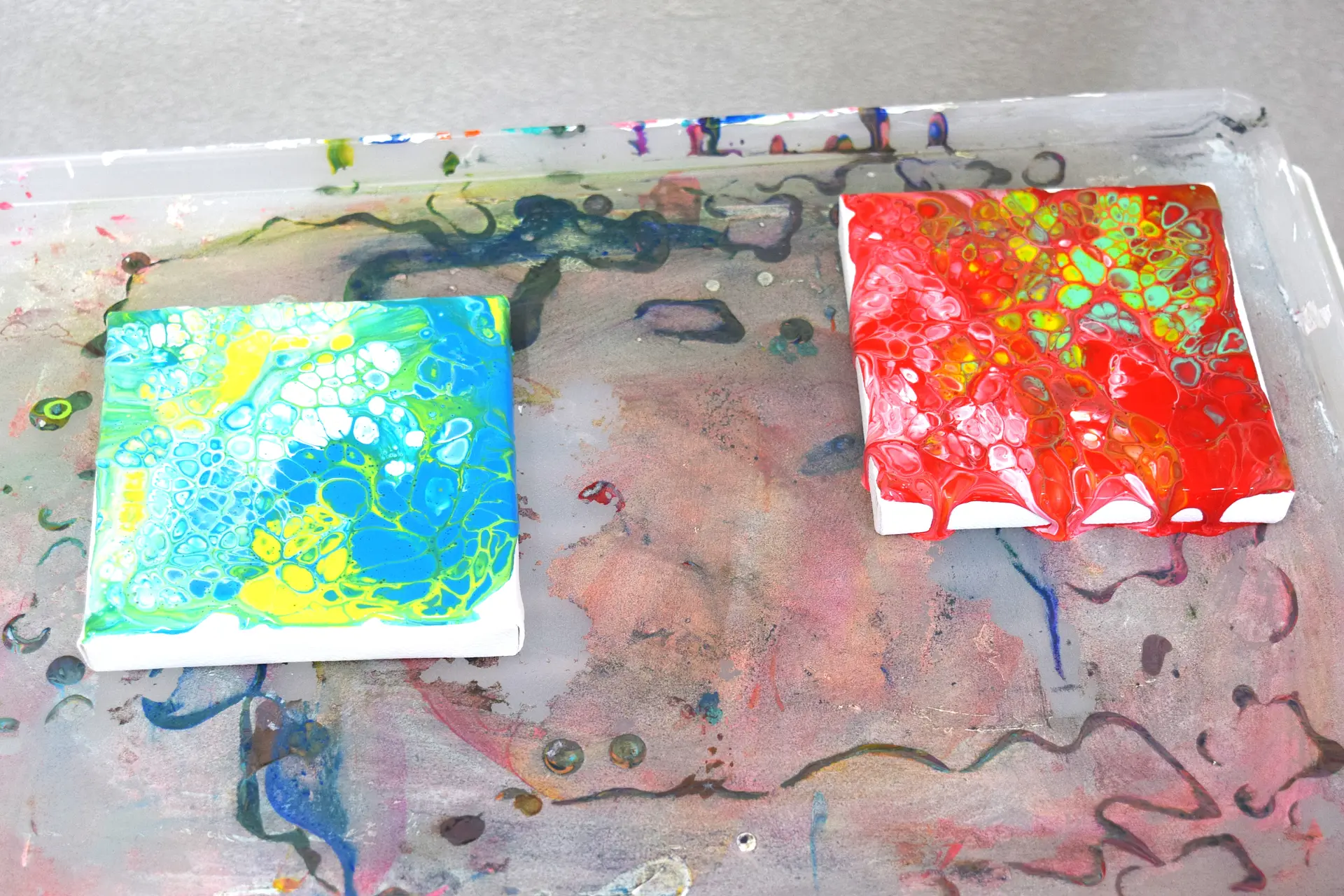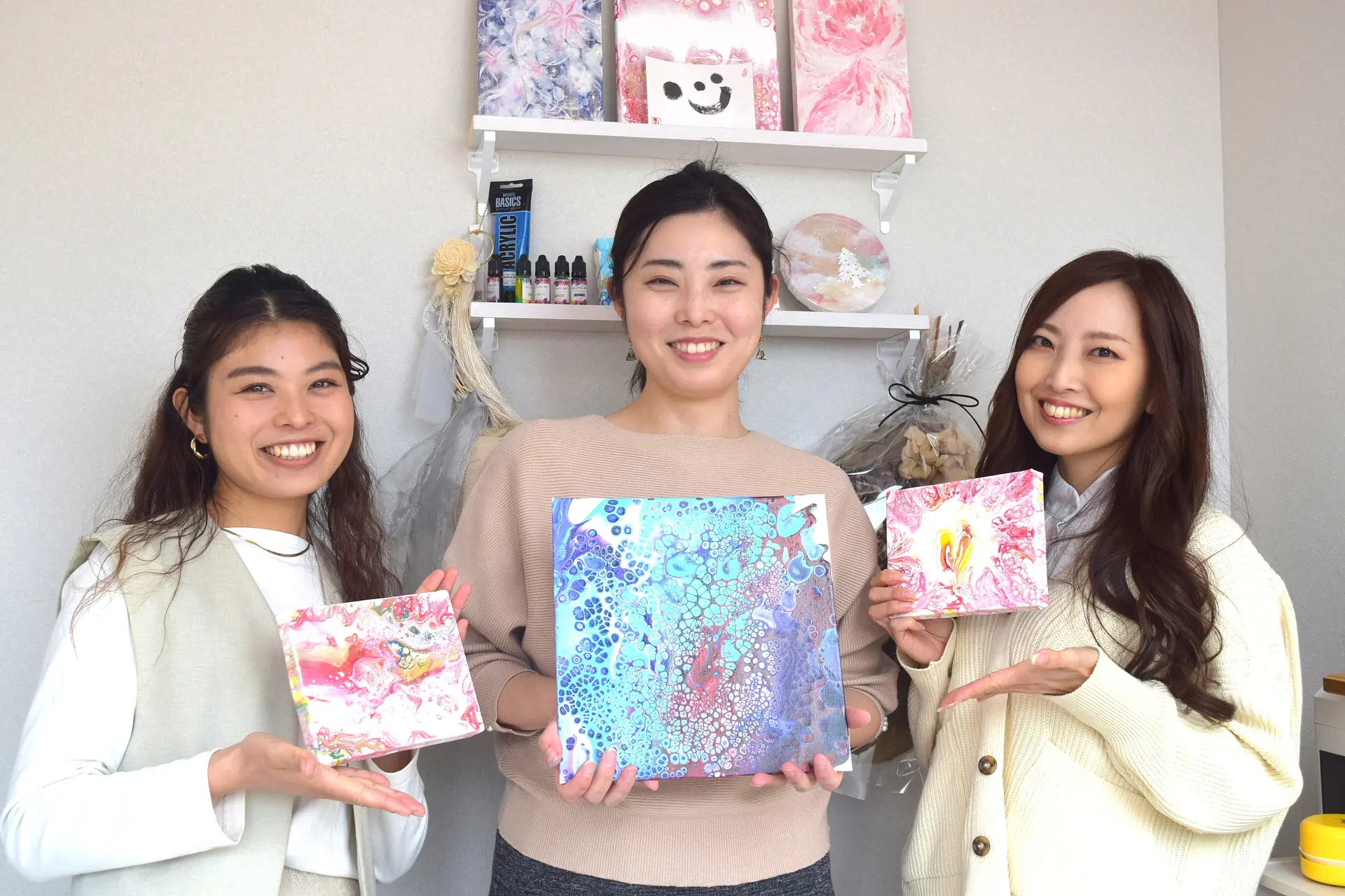 わたしたちが教わったのは、小さなキャンパスに世界にたった一つのオリジナルアートを作り上げる体験。まず好きな色のアクリル絵の具を選び、専用の液体を混ぜ、容器に充填させていきます。次に、キャンパスを容器の上に乗せひっくり返し、絵の具を思い思いにのばします。最後に先生が表面を炙ると、下の絵の具の色が浮き上がり、不思議な模様に。