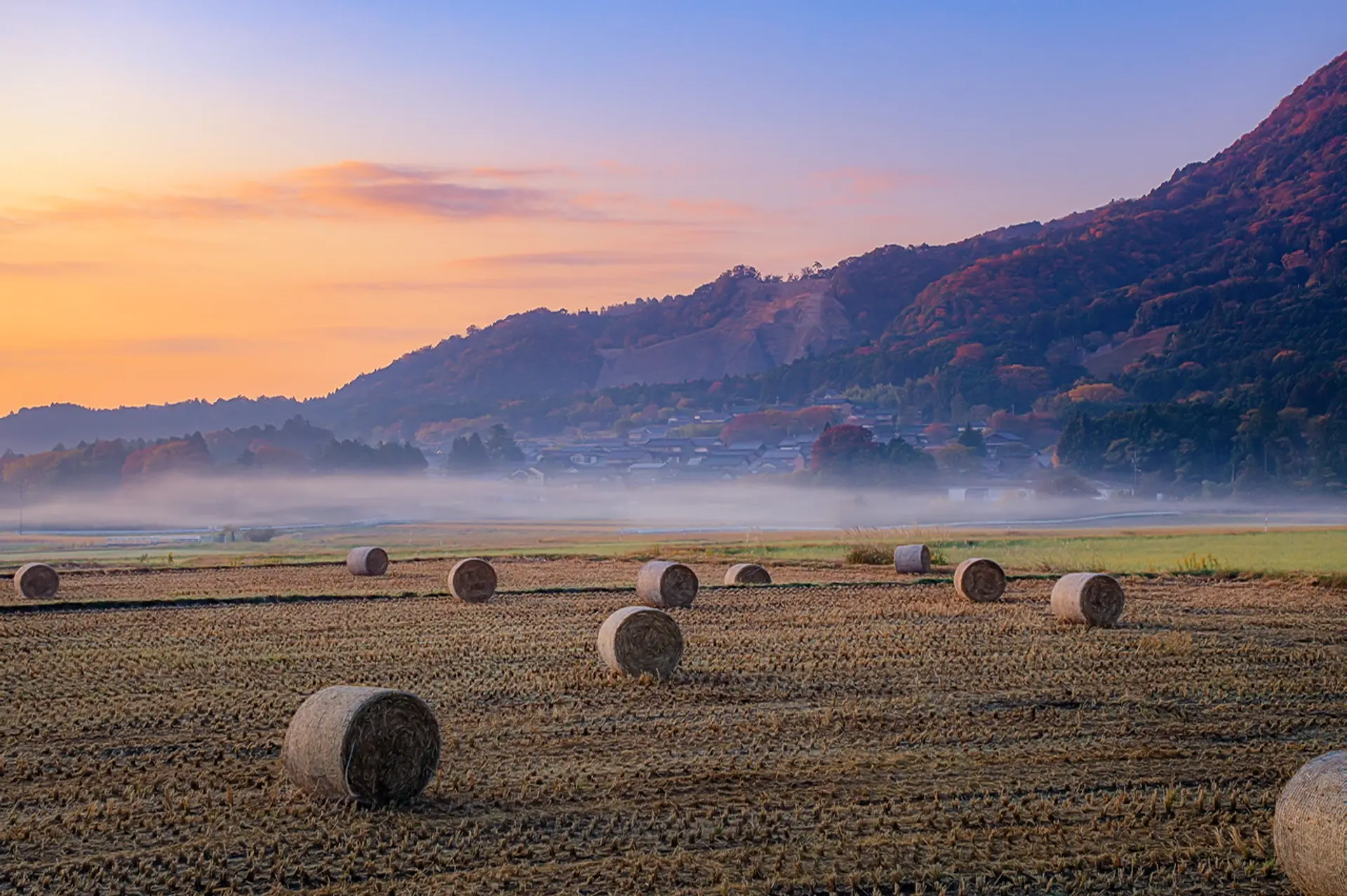 | 撮影者コメント | 牛の餌となる稲藁ロールは出来上がってからわずか数日で回収されるので、その間に朝靄が発生する確率は非常に低いのですが、この時はラッキーにもその条件が揃い、さらには背景の山も紅葉していて、滅多に見られることのない光景に出会えました。 |