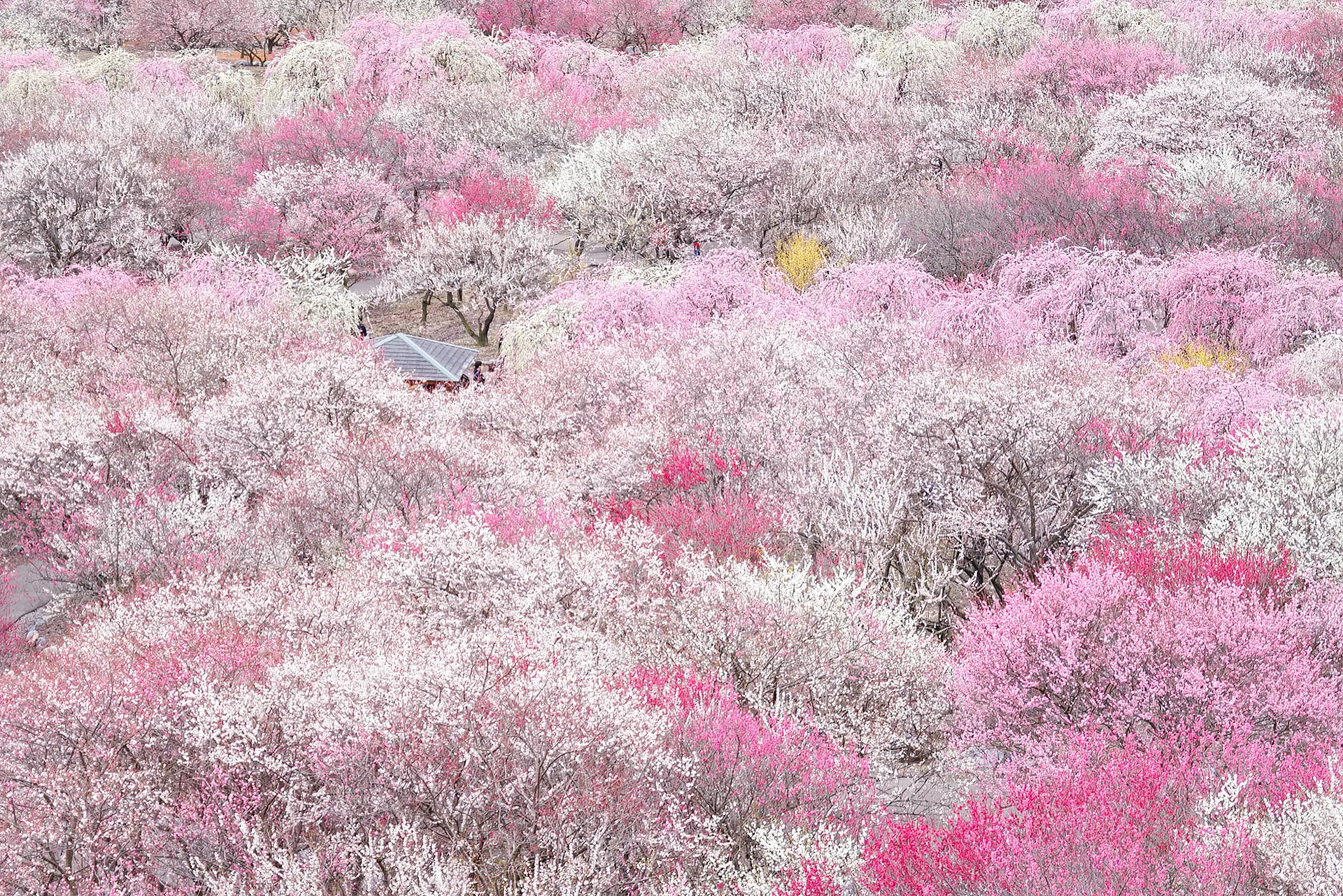 38haの梅林公園には、実梅を中心とした広大な梅林と、花梅を中心とした濃淡様々な梅が咲き乱れます。