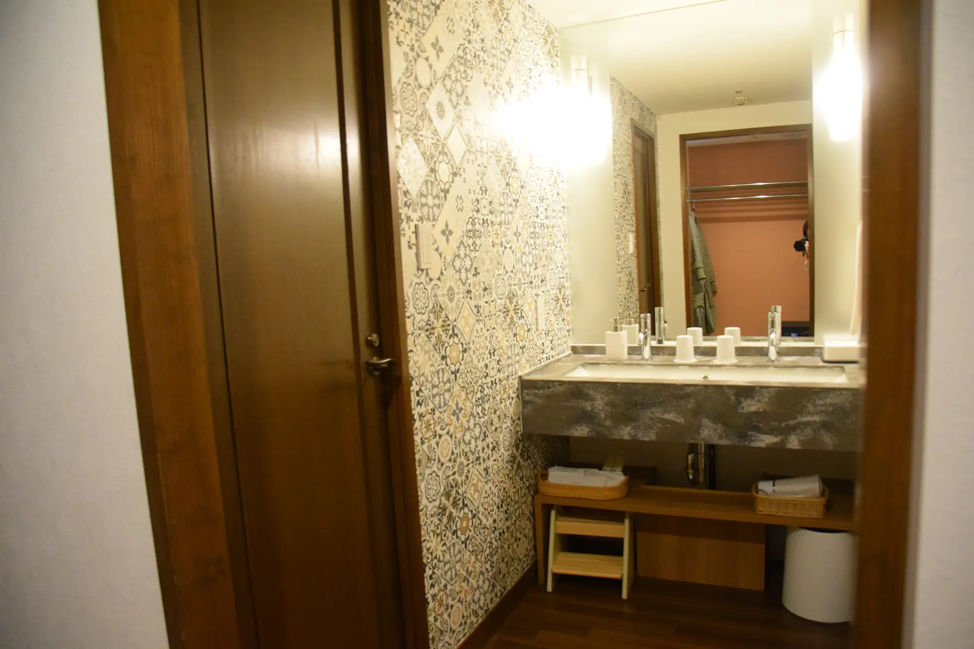 客室の入口で靴を脱ぐスタイルで、洗面化粧台もとっても広く、踏み台もあるので小さなお子さんも過ごしやすいです。