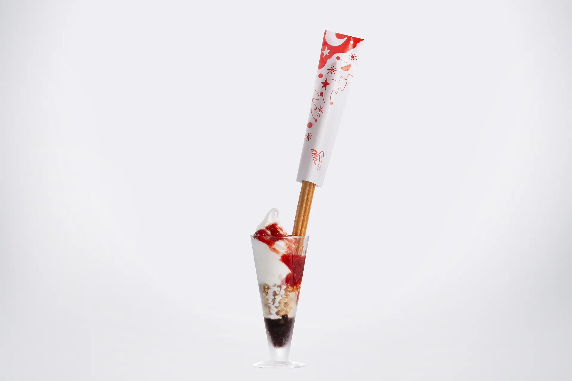イートインではチュロスが1本丸ごとささったインパクト抜群のチュローーーングいちごサンデー(税込1,200円)も頂けますよ♪