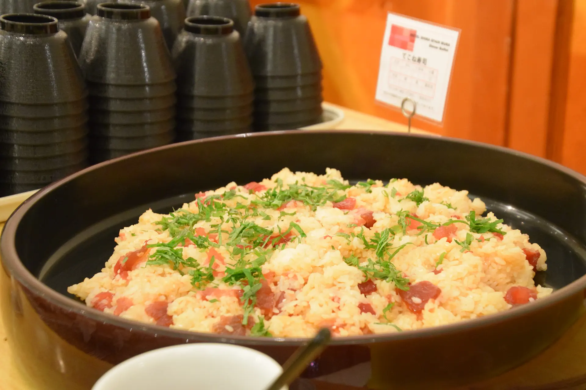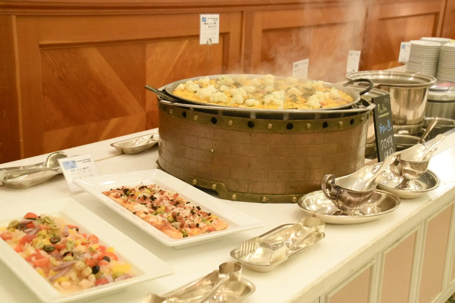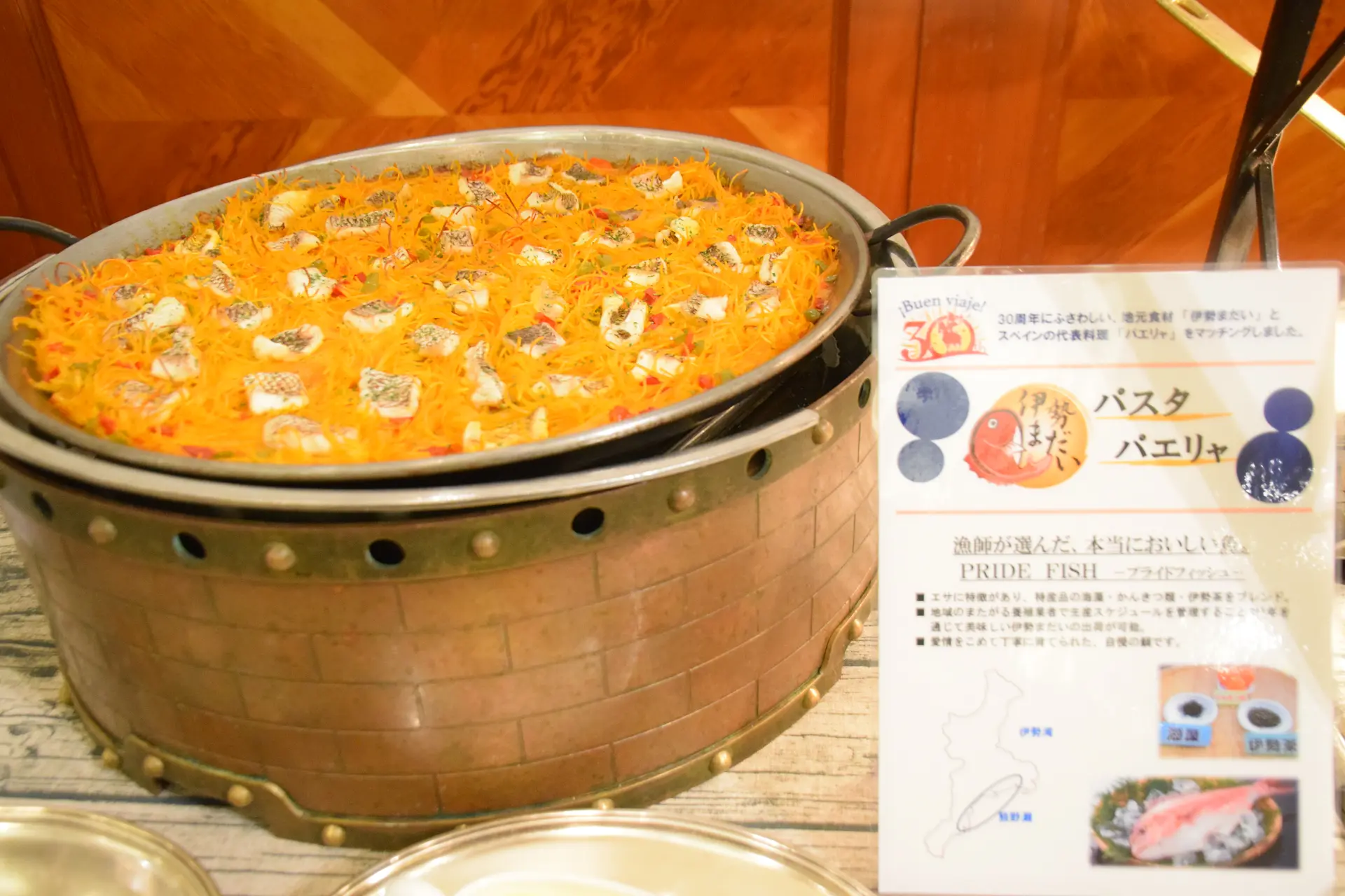 30周年にふさわしい地元の食材「伊勢まだい」とスペインの代表料理「パエリャ」をマッチングしたパスタパエリャや、伊勢健康豚の塩こうじ焼き、ライスコロッケなどの、30年間の中で特に人気だったメニューが30周年記念コーナーに並びます。さらに、揚げたての天ぷらやローストビーフなどライブキッチンもあり豪華なラインナップ。