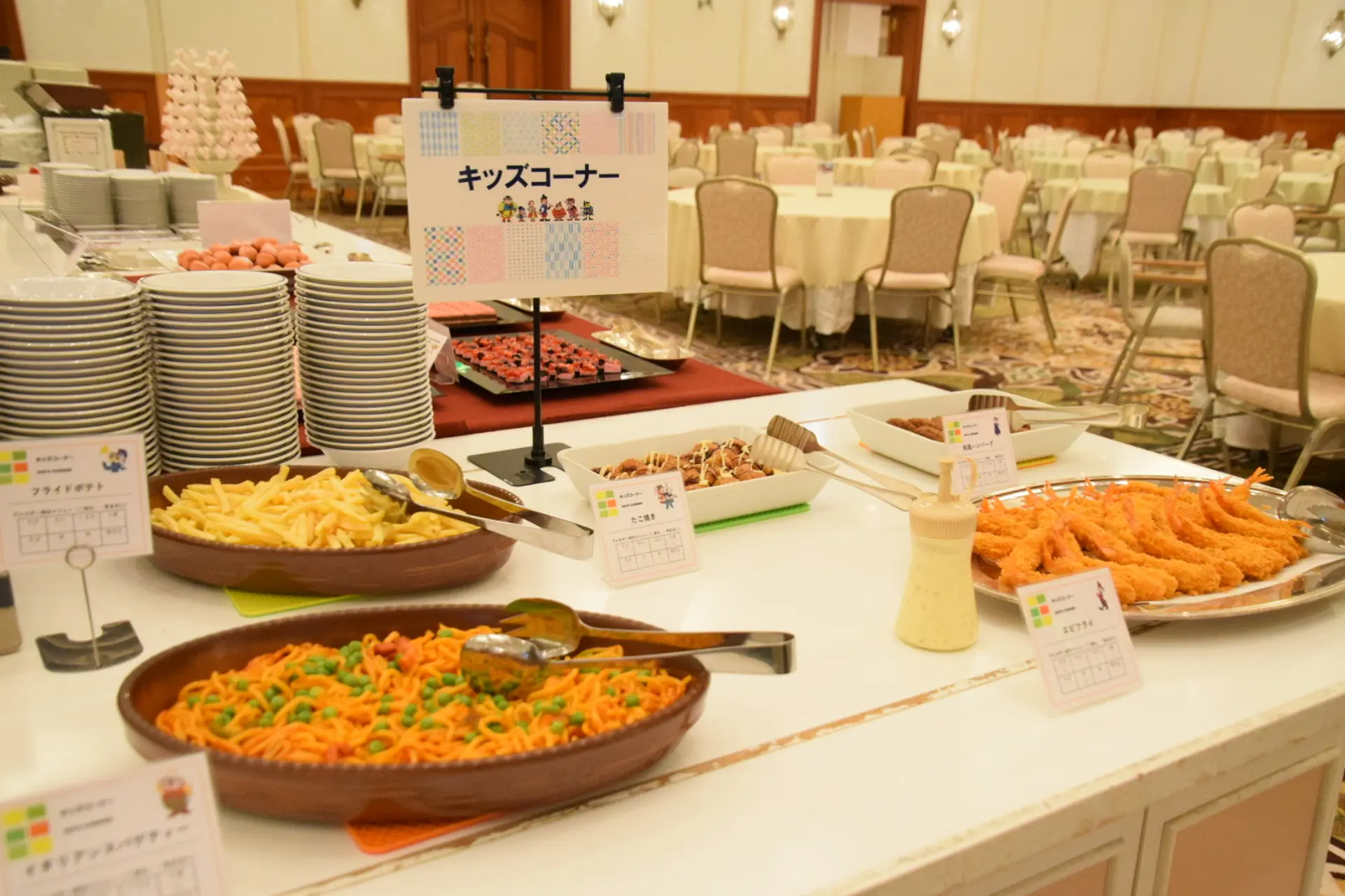 キッズコーナーには、ナポリタンスパゲッティにポテト、ハンバーグやエビフライ、そしてたこやきもあり、子供も大喜び♪