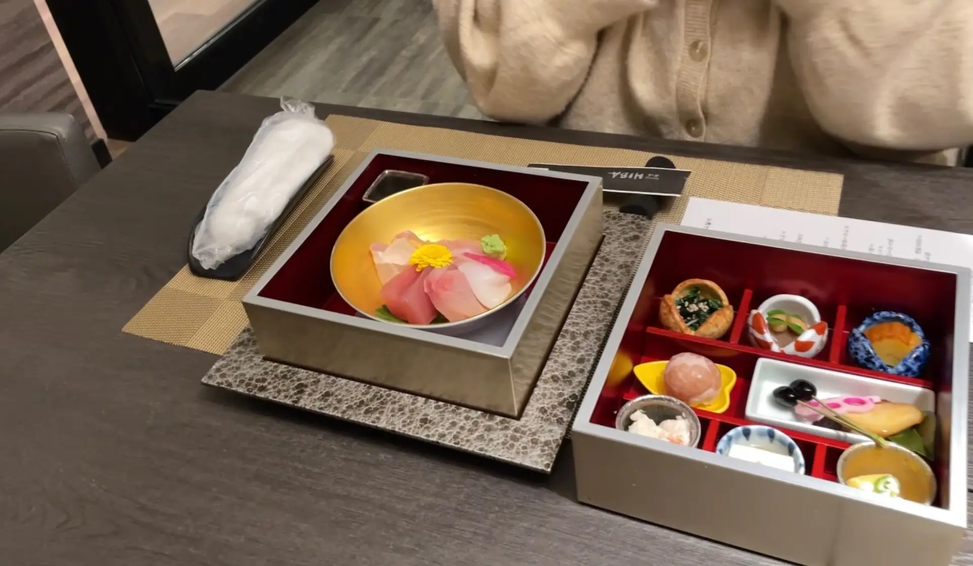 夕食は敷地内レストラン「Dining HIBA 火場」にて創作和食会席を頂きましたが、りんご郎は特等席へご案内。笑