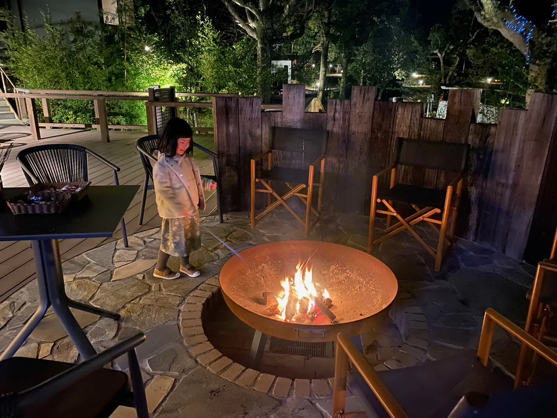 夕食を食べたあとは、焚き火を見にラウンジ前へ。