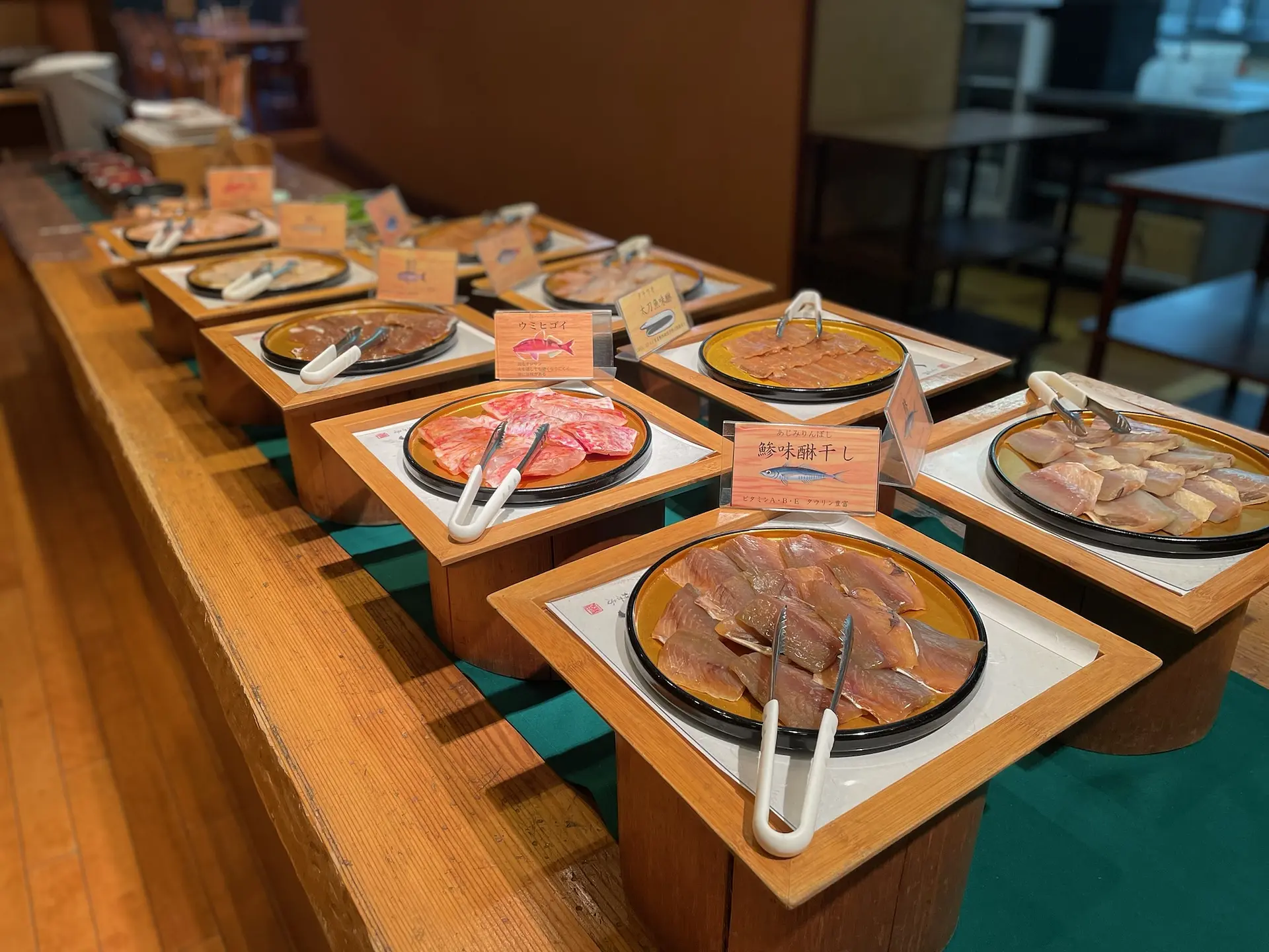 朝食は姉妹館の ホテル季の座(ときのざ) にある「楽天茶寮」にて干物バイキングを頂きました。