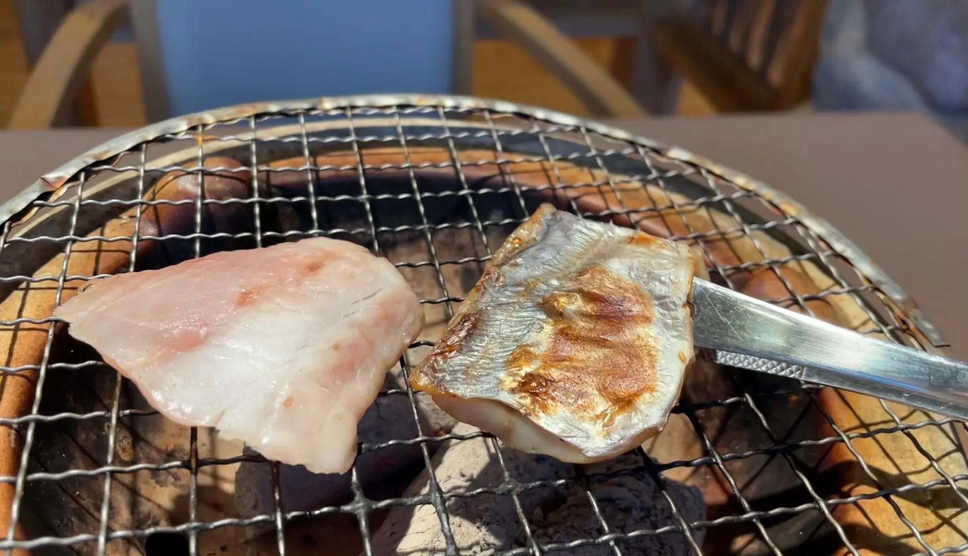 新鮮な魚を七輪で焦げ目がつくくらい焼き、香ばしい匂いに食欲はさらに加速。