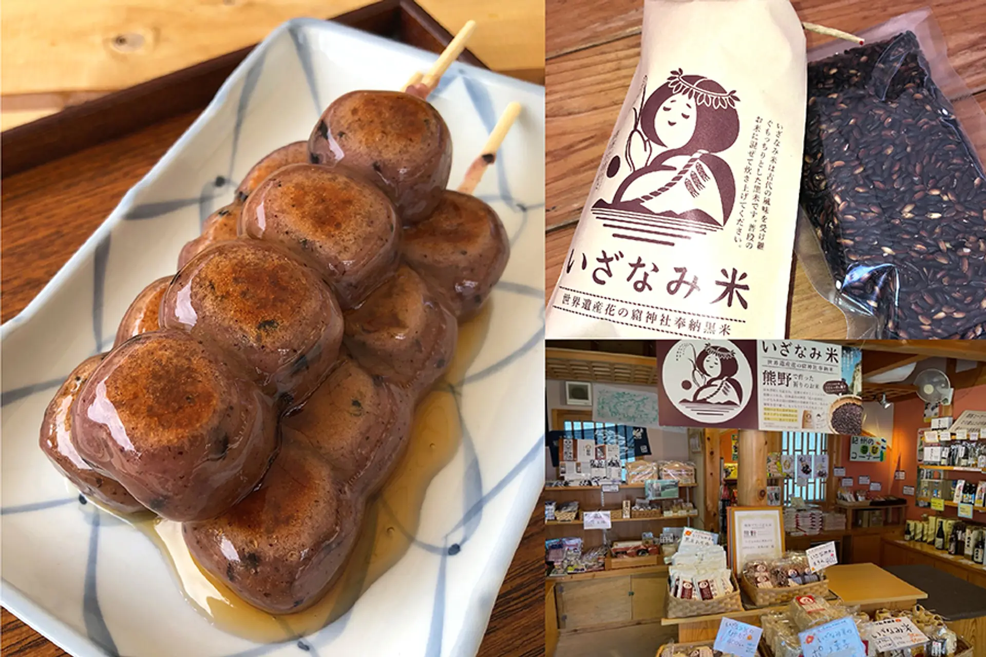 世界遺産にもなっている花の窟神社に隣接し、神社への奉納米である古代米「いざなみ米」を生地に練りこんだだんごを販売しています。紫色に色づいているのは黒米であるいざなみ米の色から。注文を受けてから焼くため、パリッと焼きたてが楽しめます。
