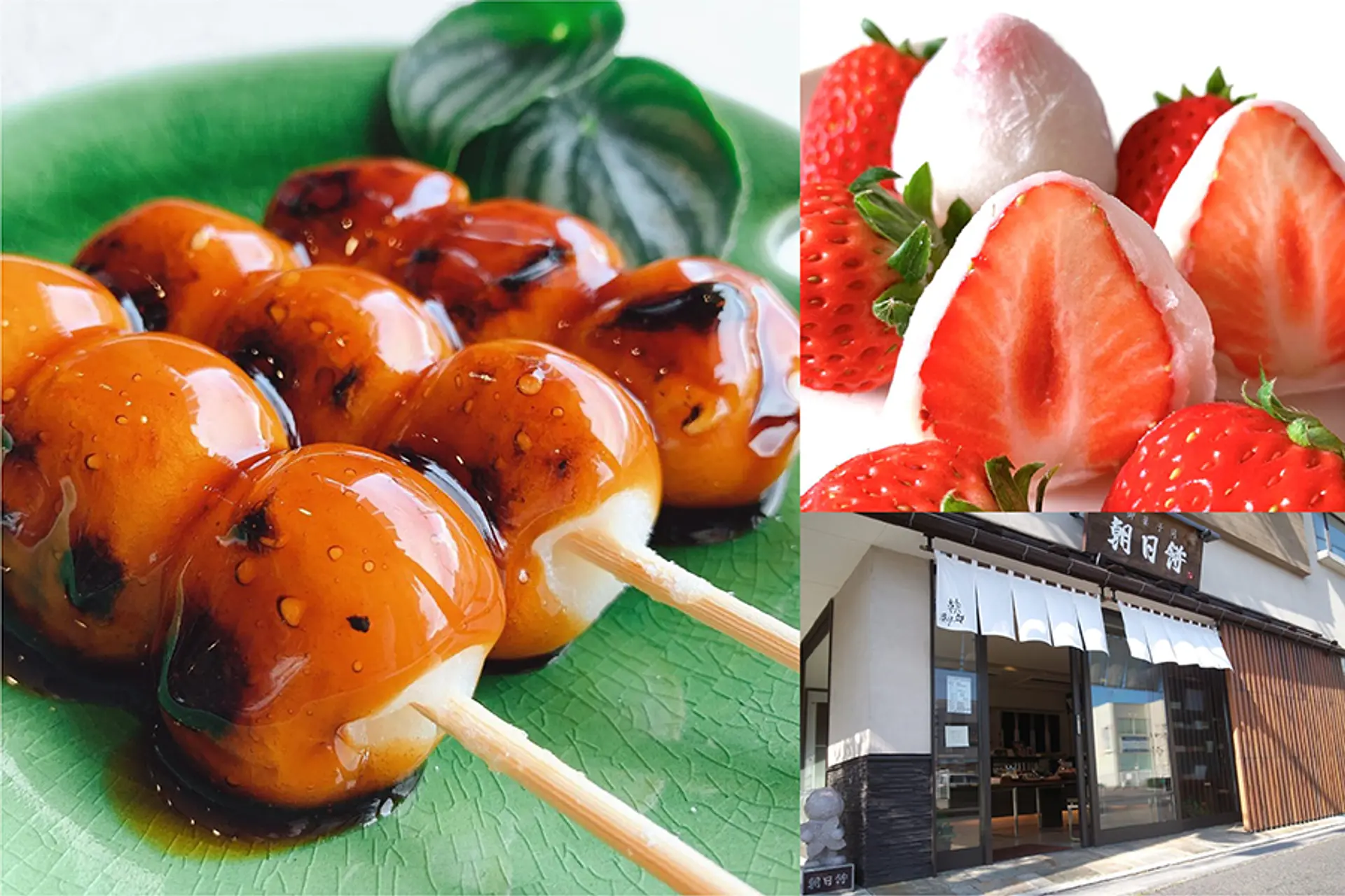 桑名市の中心部、寺町商店街にある老舗餅菓子店です。一番人気の「みたらし団子」は店頭で焼きたてを提供しています。三重県産コシヒカリで作る生地と、上新粉で作る生地を混ぜ合わせ、醤油味のたれをかける香ばしい味わいです。