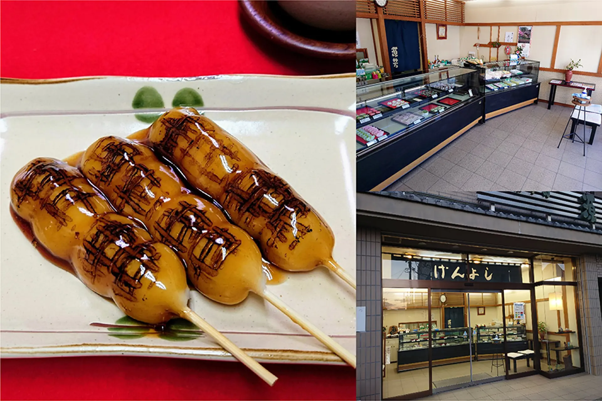 創業明治38年、地元で愛される老舗和菓子店のだんごは伊賀米を100%使用しています。独自に製粉することにこだわり、もちもち食感が楽しめます。はさめず醤油など数種類をブレンドした秘伝のタレをつけて召し上がれ。