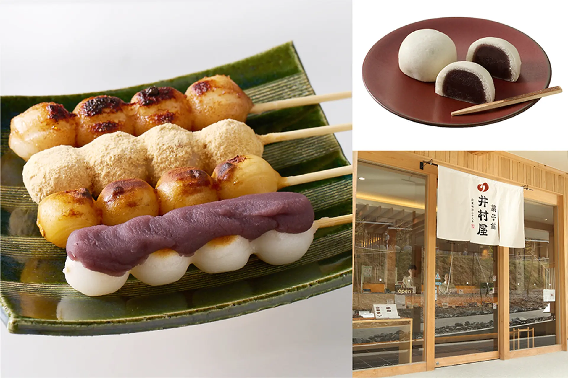 多気町のヴィソンにある、あずきバーでおなじみ「井村屋」のお店。三重県産の上新粉で作るコシと弾力のある杵つきだんごに、伊勢醤油をつけて焼き上げました。こしあん、きなこ、あずき味噌だれもあります。