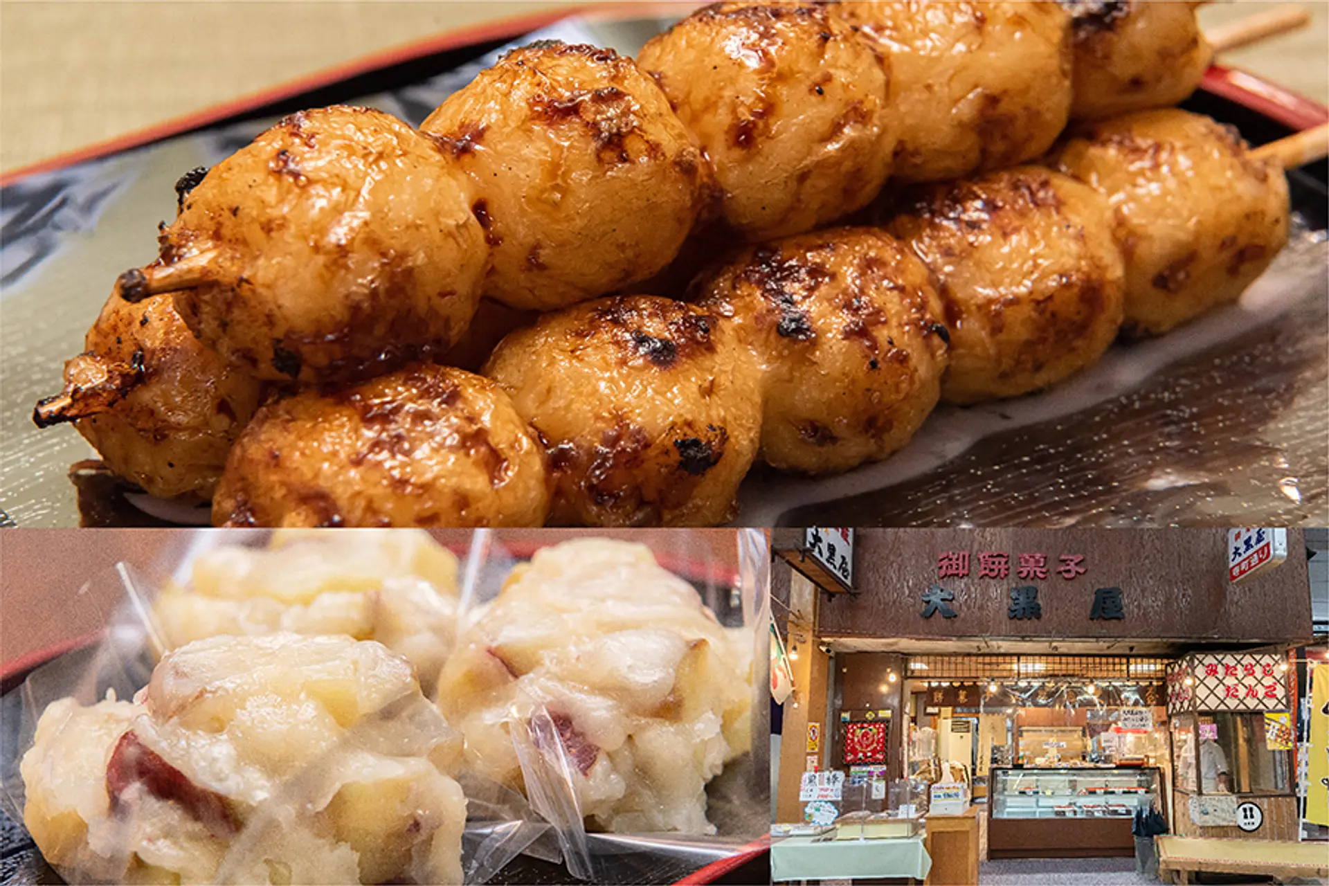 国産上新粉の生地を杵でつく「みたらしだんご」、もち米とうるち米を混ぜた「やじろ」、もち麦特有のぷちぷち食感を持つ「もち麦やじろ」の3種類を販売しています。注文を受けてから焼くので焼きたてアツアツ。吉野葛でとろみをつけたタレがたっぷりかけられています。
