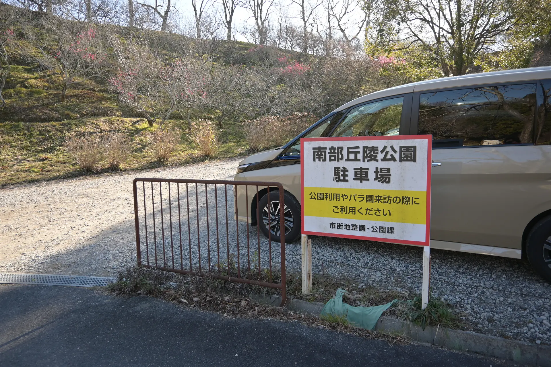南部丘陵公園には多くの駐車場がありますが、お天気のいい日は冬でも満車になることも。狭い入口から入ったバラ園の駐車場は穴場スポット。7台ほど停めることができ、ここから北ゾーンに行けます。途中にあるデイキャンプ場の駐車場にも6台ほど停められます。
