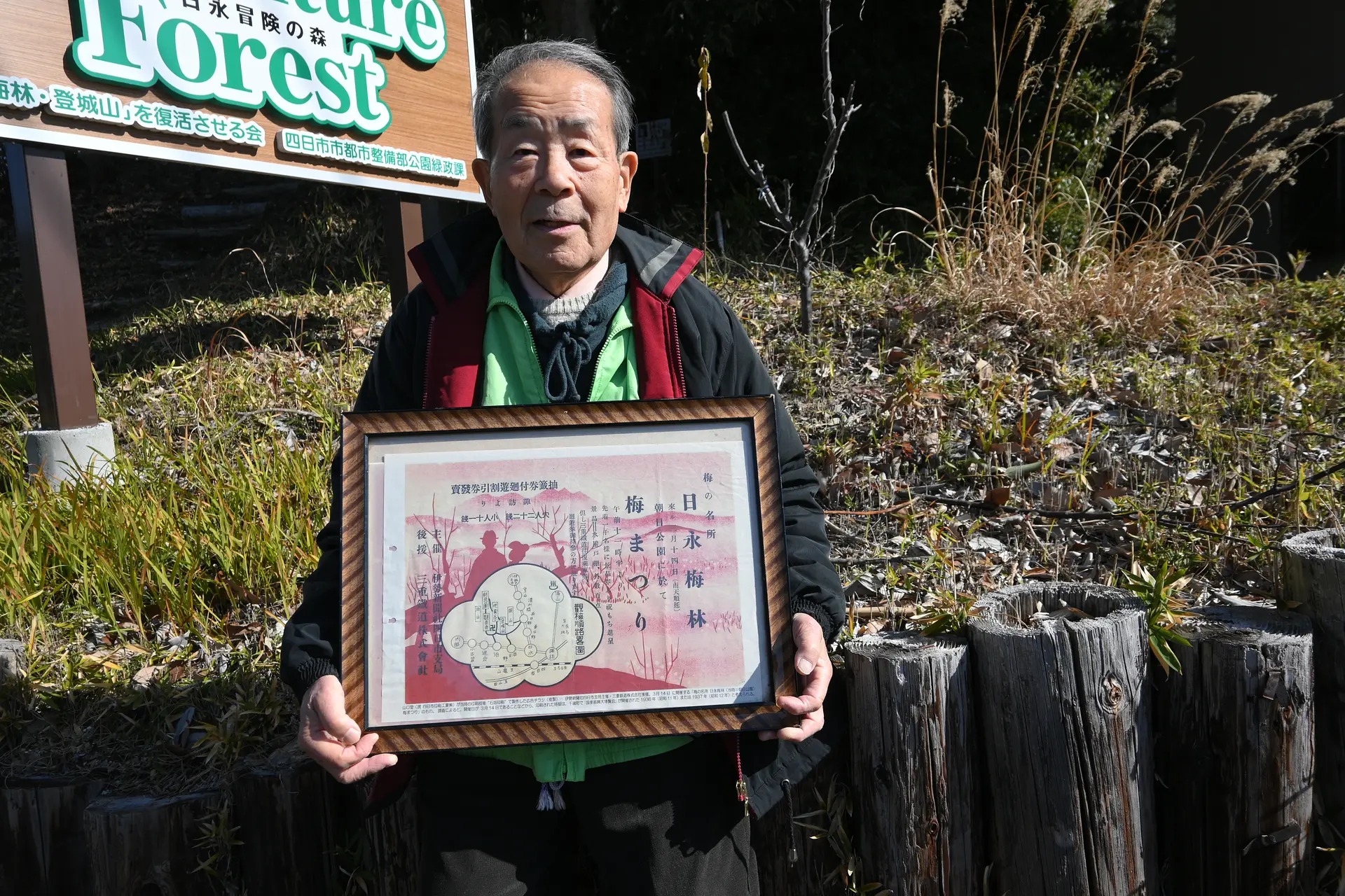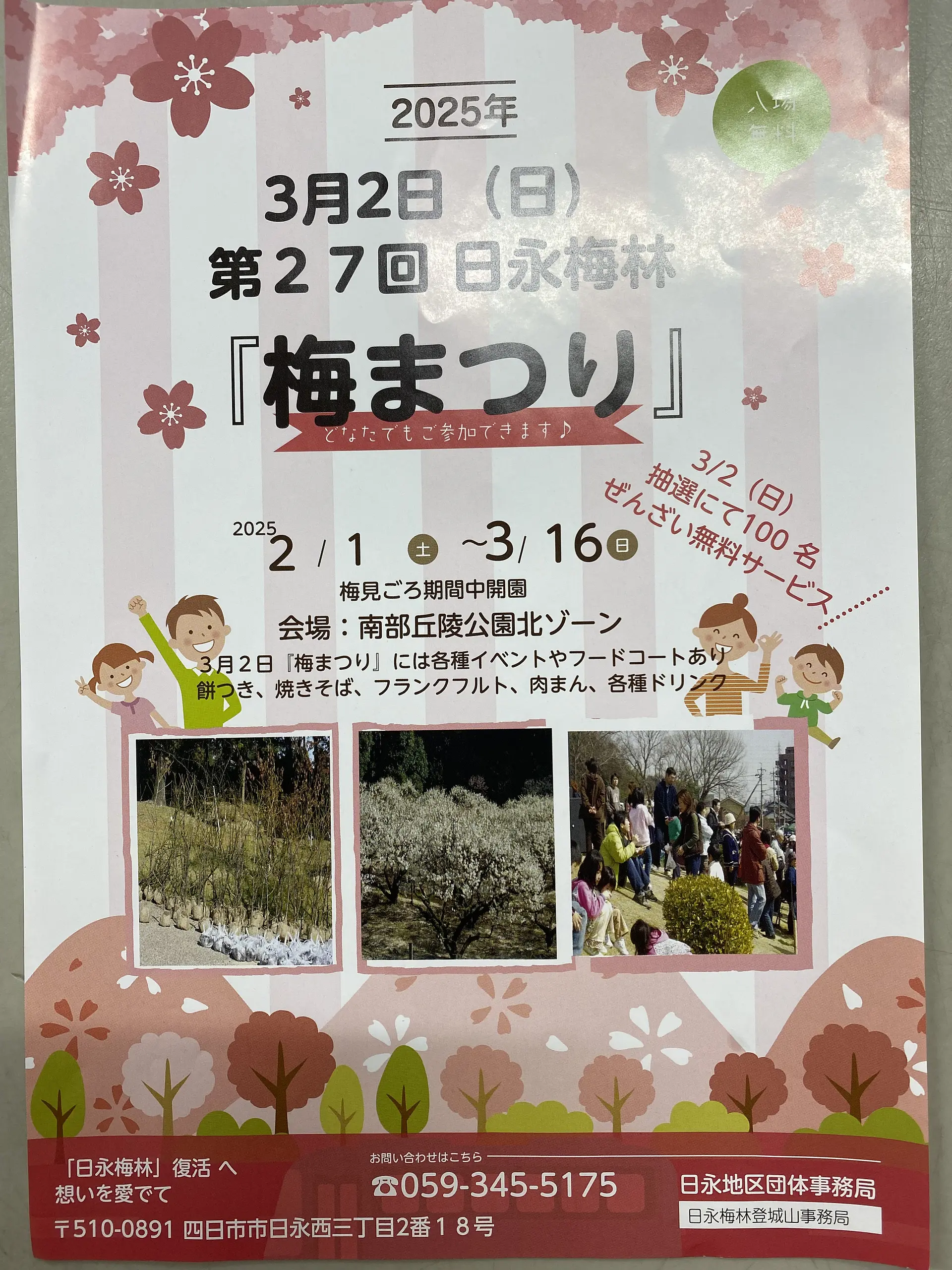 戦争中に軍事施設が造られ、梅の木は伐採され梅林は姿を消しました。25年ほど前に市民団体の「日永梅林・登城山」を復活させる会が、「梅林を復活させよう」と、植樹を始め、梅の木の育成管理をしています。毎年6月に梅ちぎり会、11月に植樹会、3月に梅まつりを開いています。会長の小池さんに当時の梅まつりのチラシを見せてもらいました。