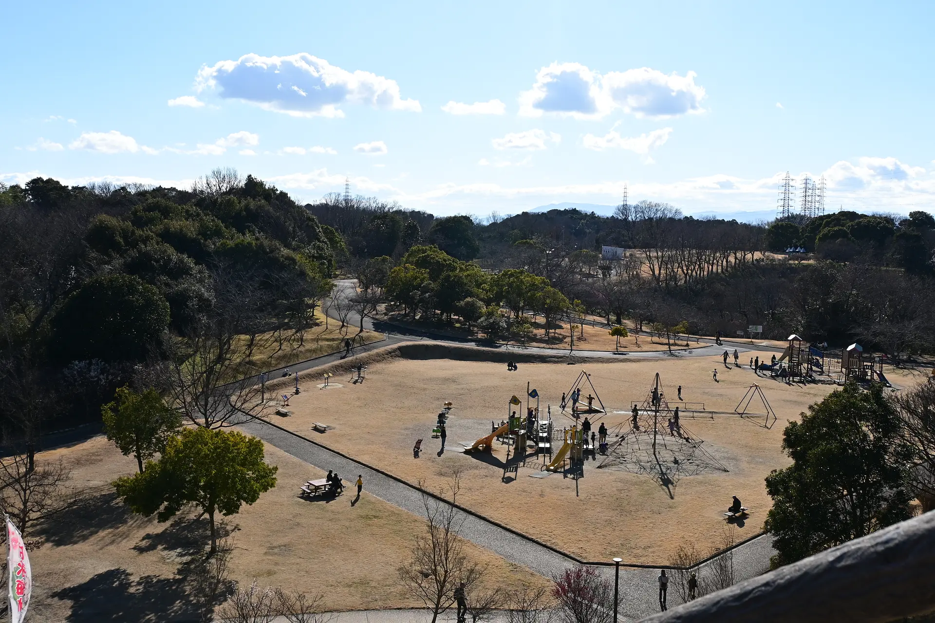 76段の階段を頑張って登ると、展望台から公園を見下ろせます。梅の咲く場所や遊具を上から見てみました。