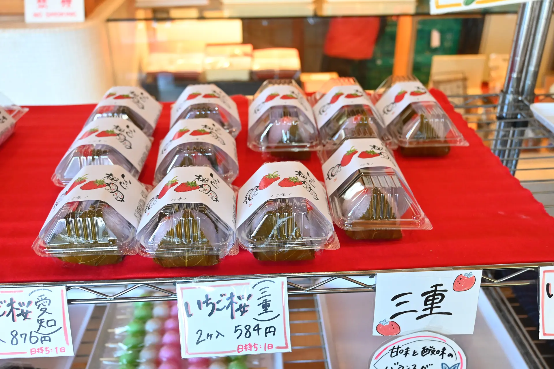 春の和菓子と言えば、桜餅や苺大福。ことよでは三重県産と愛知県産のいちごを使った桜もちがあります。桜の葉の香りといちごの美味しさ、ほんのりピンクの道明寺のお餅との相性が抜群です。