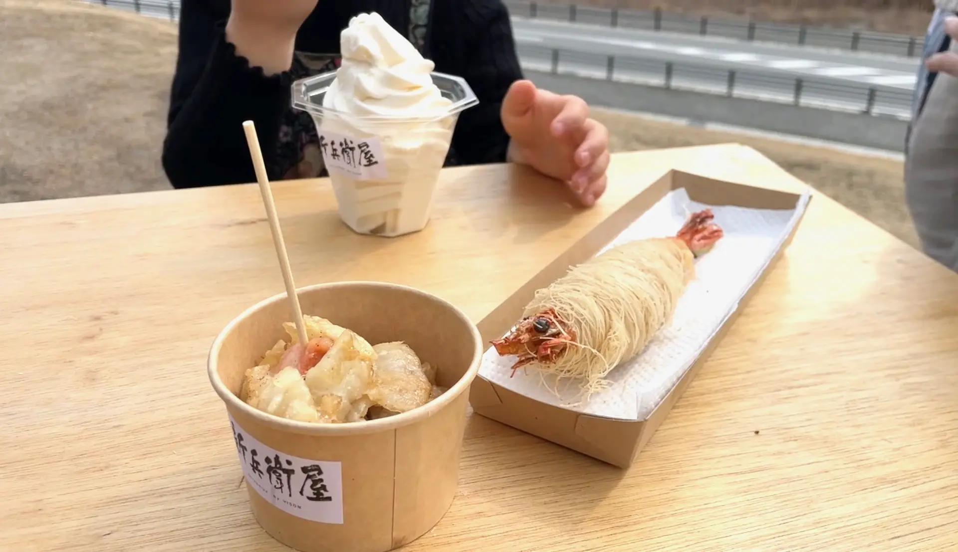 我が家は一番人気の"えびのパリパリ天"と、期間限定メニューの"鮭天"、ソフトクリーム(娘用)をオーダー。
