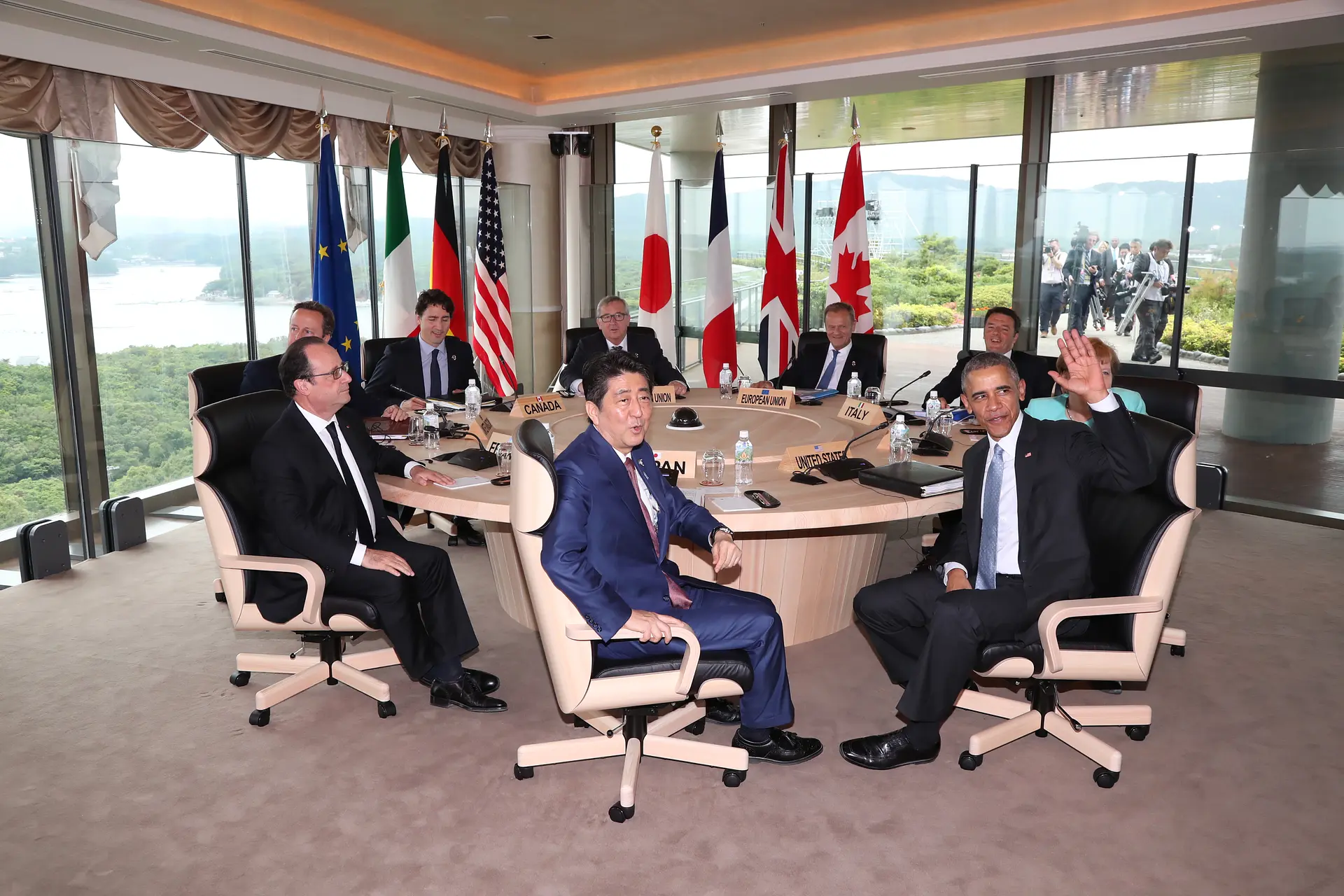 写真:英虞湾の美しい景色を背景に、会議に臨む各国首脳たち(志摩観光ホテル ザ ベイスイートにて)(外務省提供)