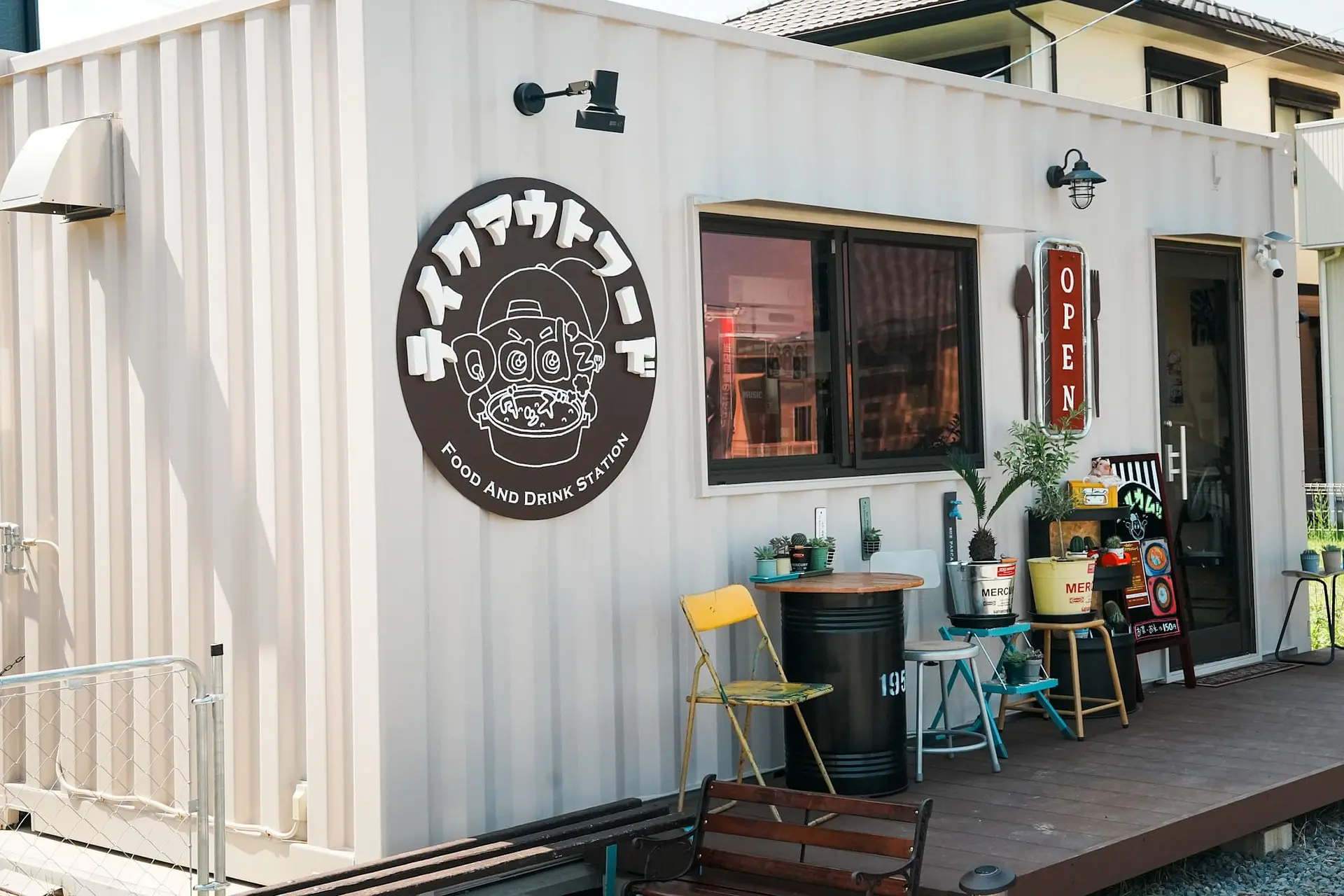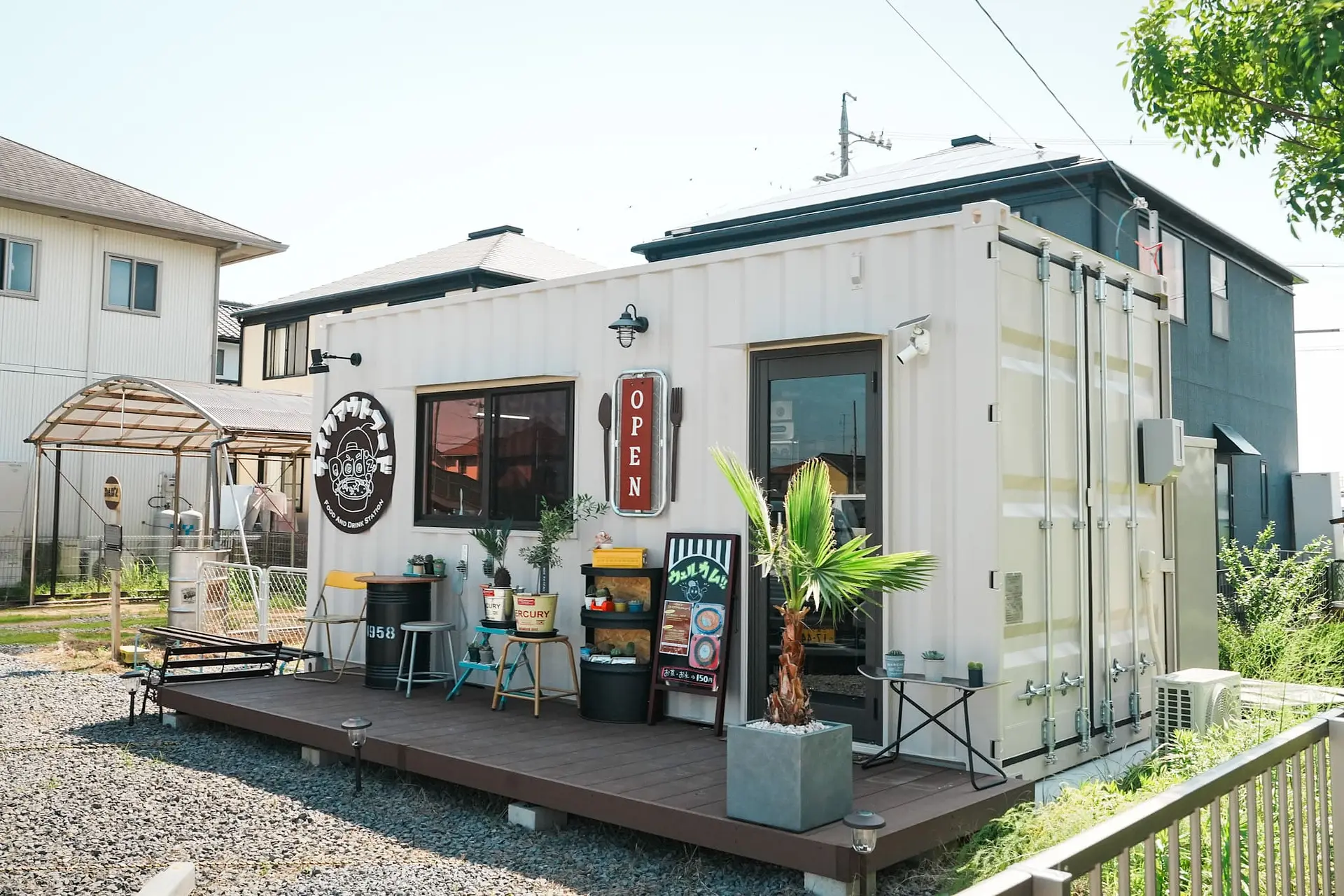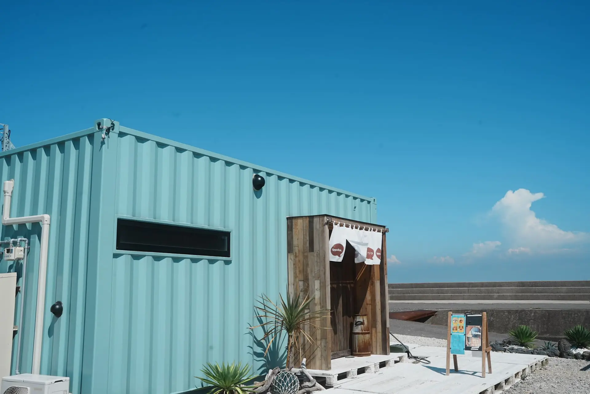 外観ですが、コンテナがターコイズブルー色にペイントされ、立て掛けたサーフボードなど、まるでアメリカの西海岸を思わせるような鮮やかな色合いと雰囲気を感じさせます。