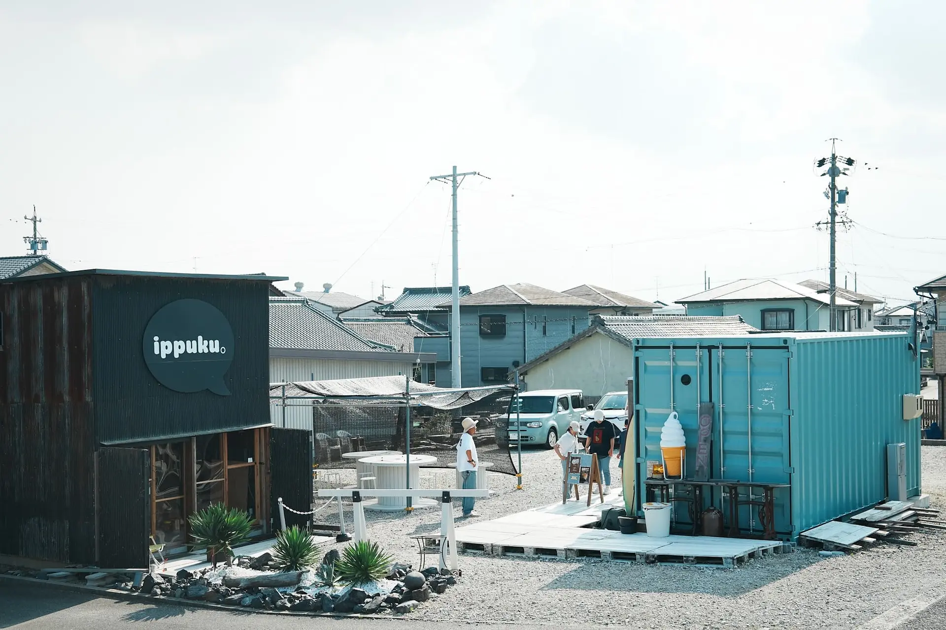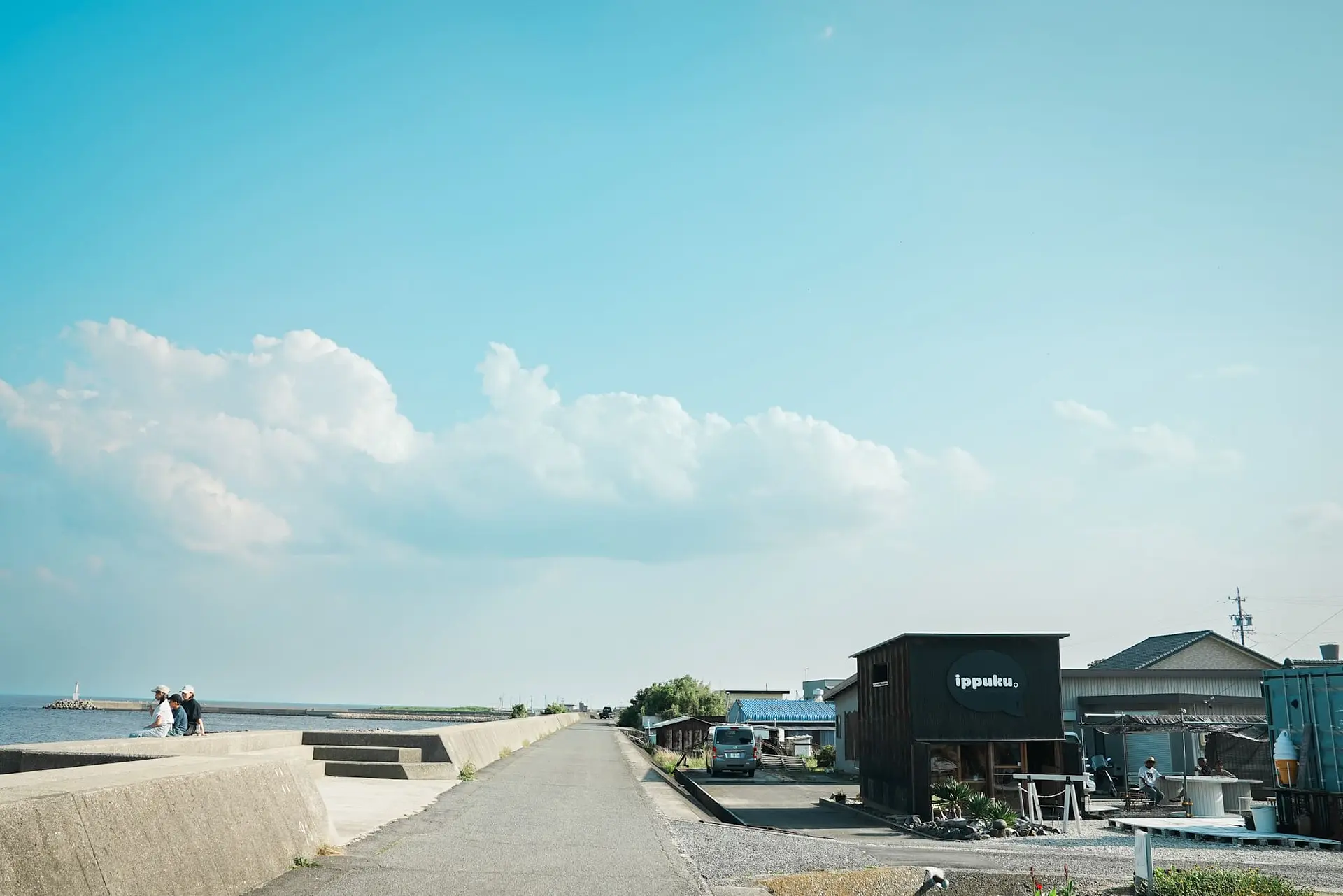海岸沿いを少し走ると、黒い建物に大きな看板『ippuku。』と書かれたロゴ看板を発見。