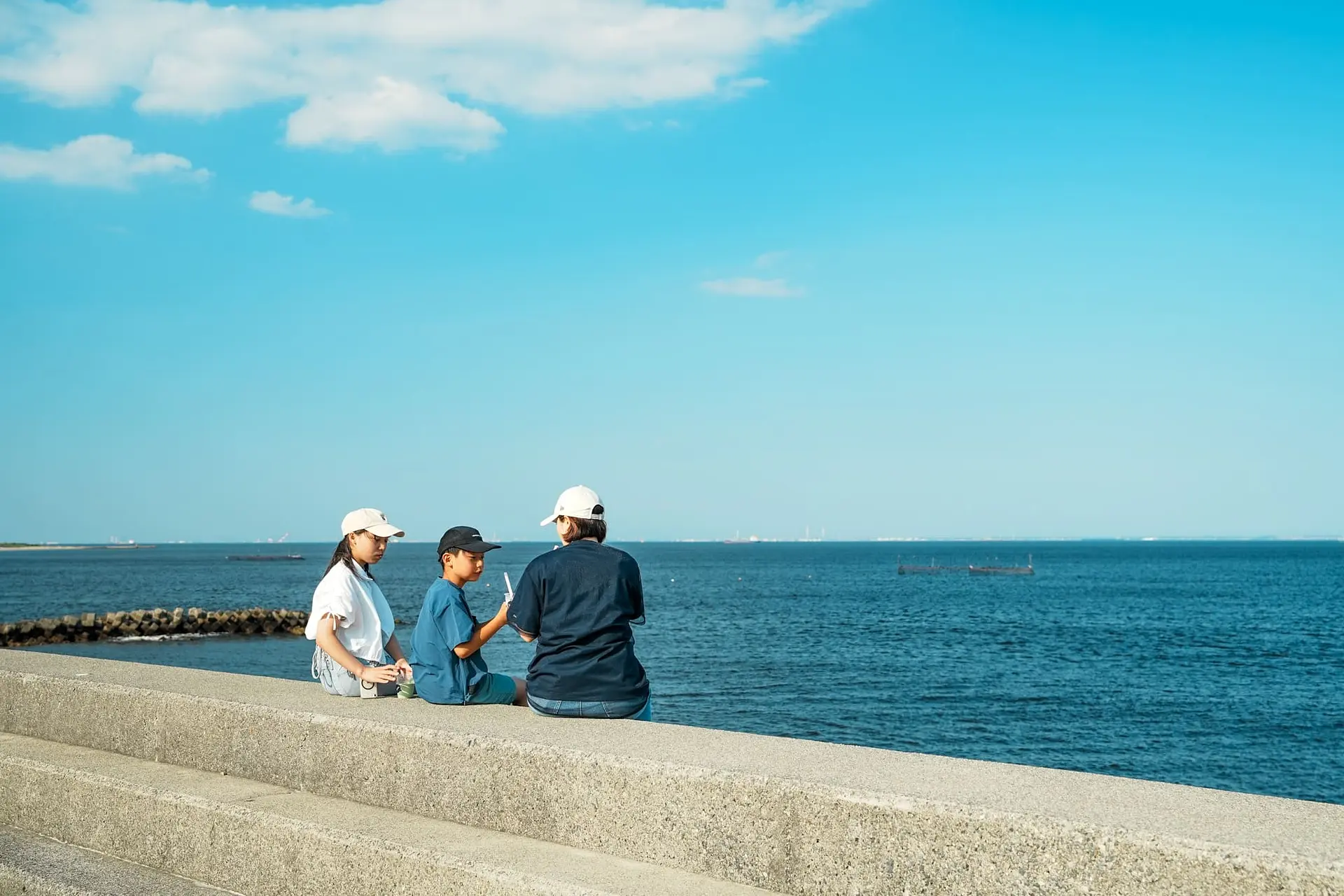 また、対岸に見えるのは、愛知県常滑市です。セントレア空港から発着する飛行機を眺めながら、穏やかな波の音と浜風を感じられる場所は、まさに"一服"できる場所です。