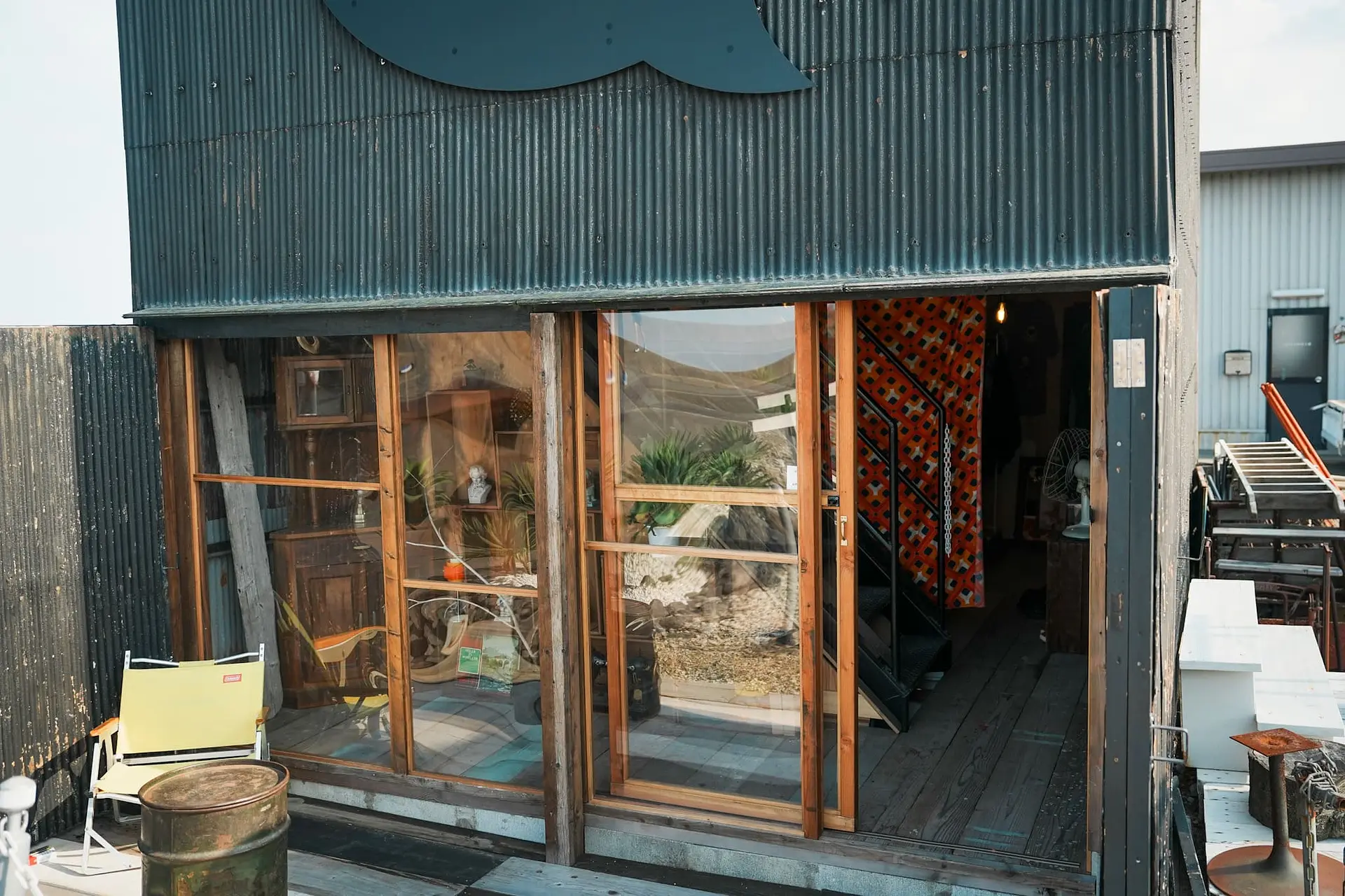 敷地内の黒一色の建物は、倉庫をご自身でリノベーションした古着屋。
