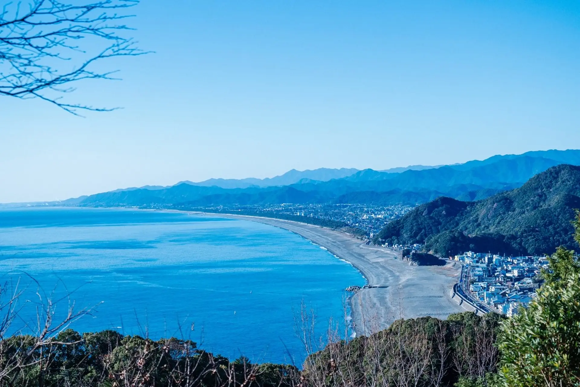 七里御浜と熊野三山の山並み(詳しくは…音声ガイド「松本峠」 08|東屋から見る七里御浜と熊野灘)