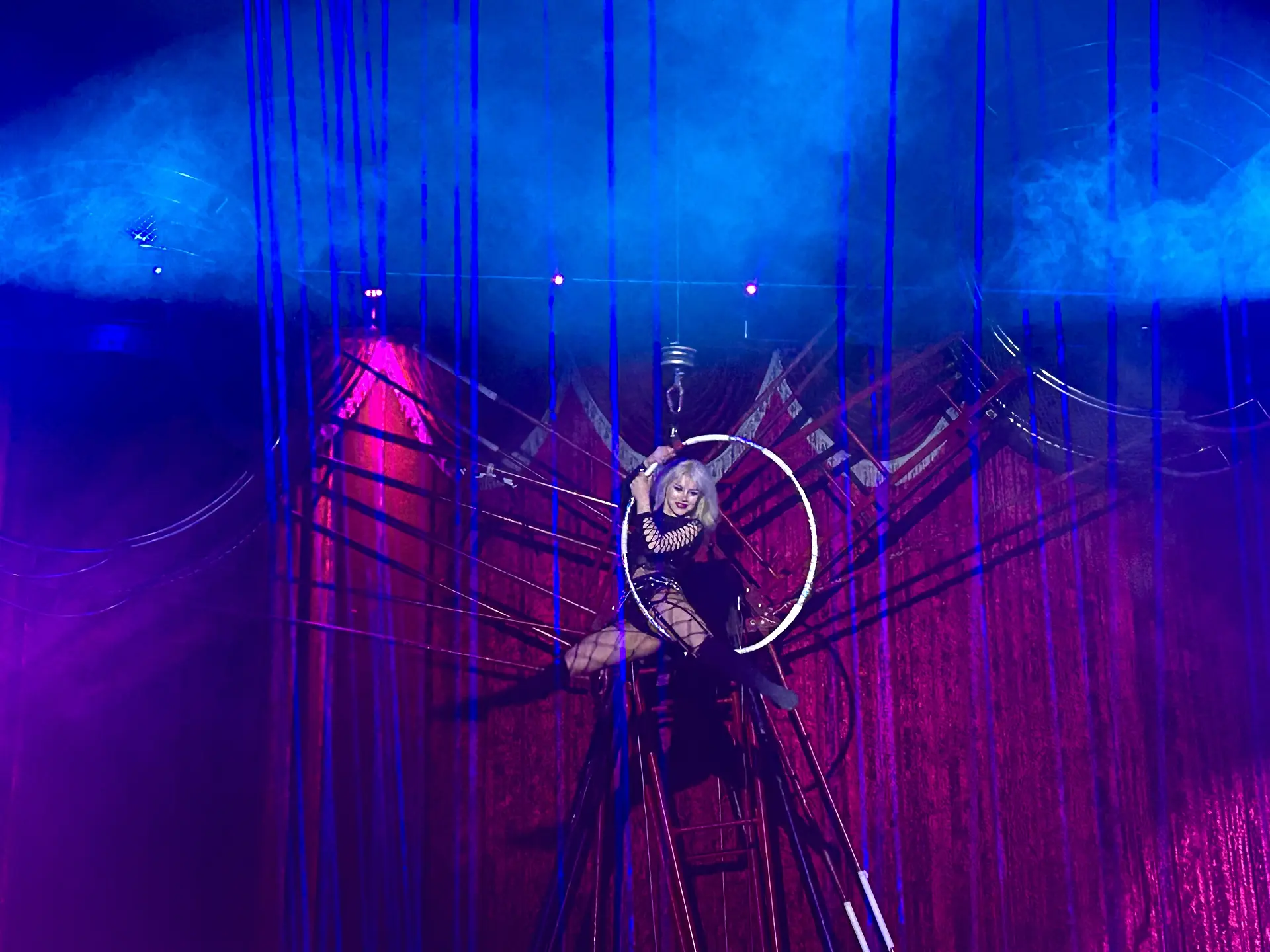 シルクファンタジーとは、天井から吊り下がる紐やフラフープを使って行われるパフォーマンスです。