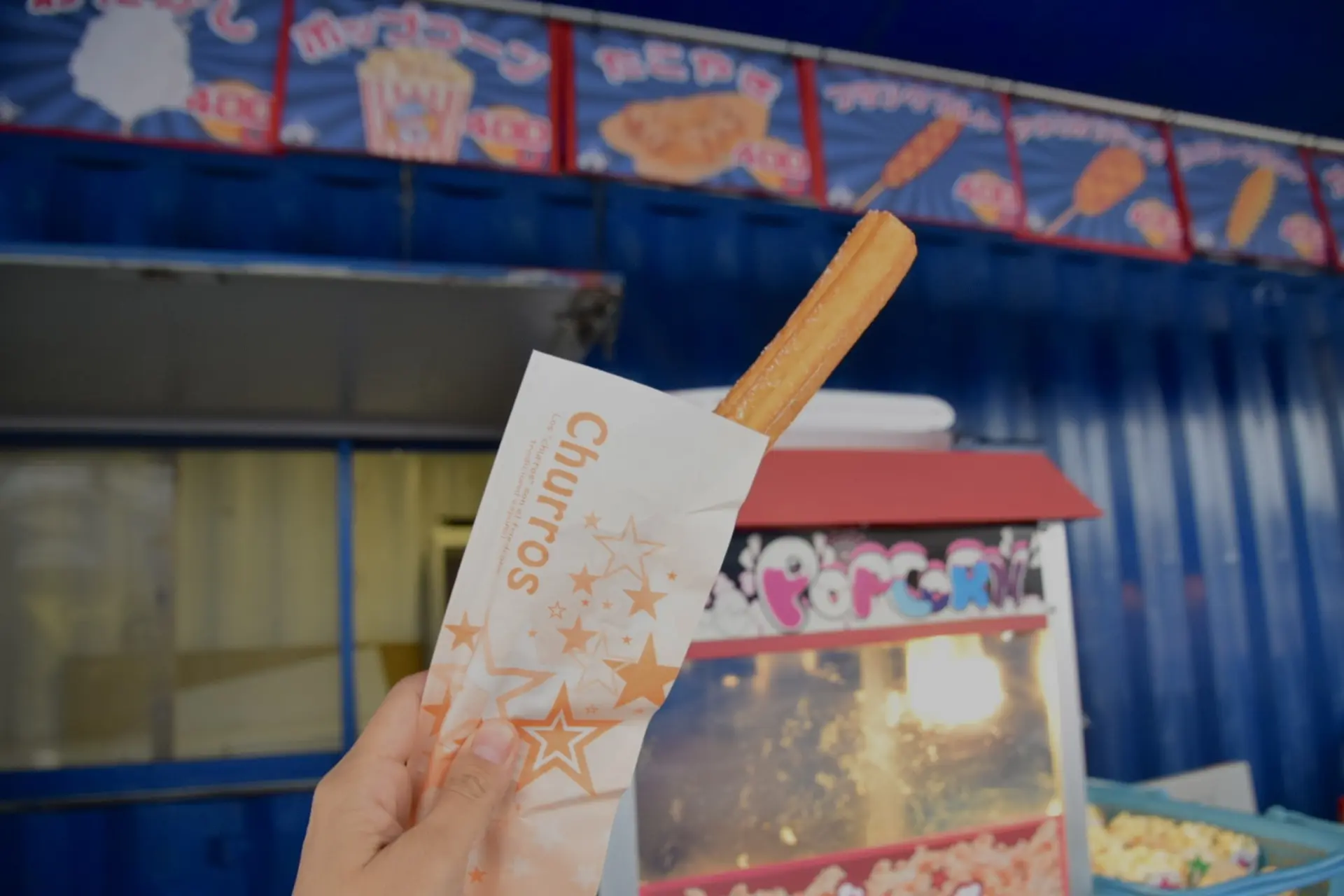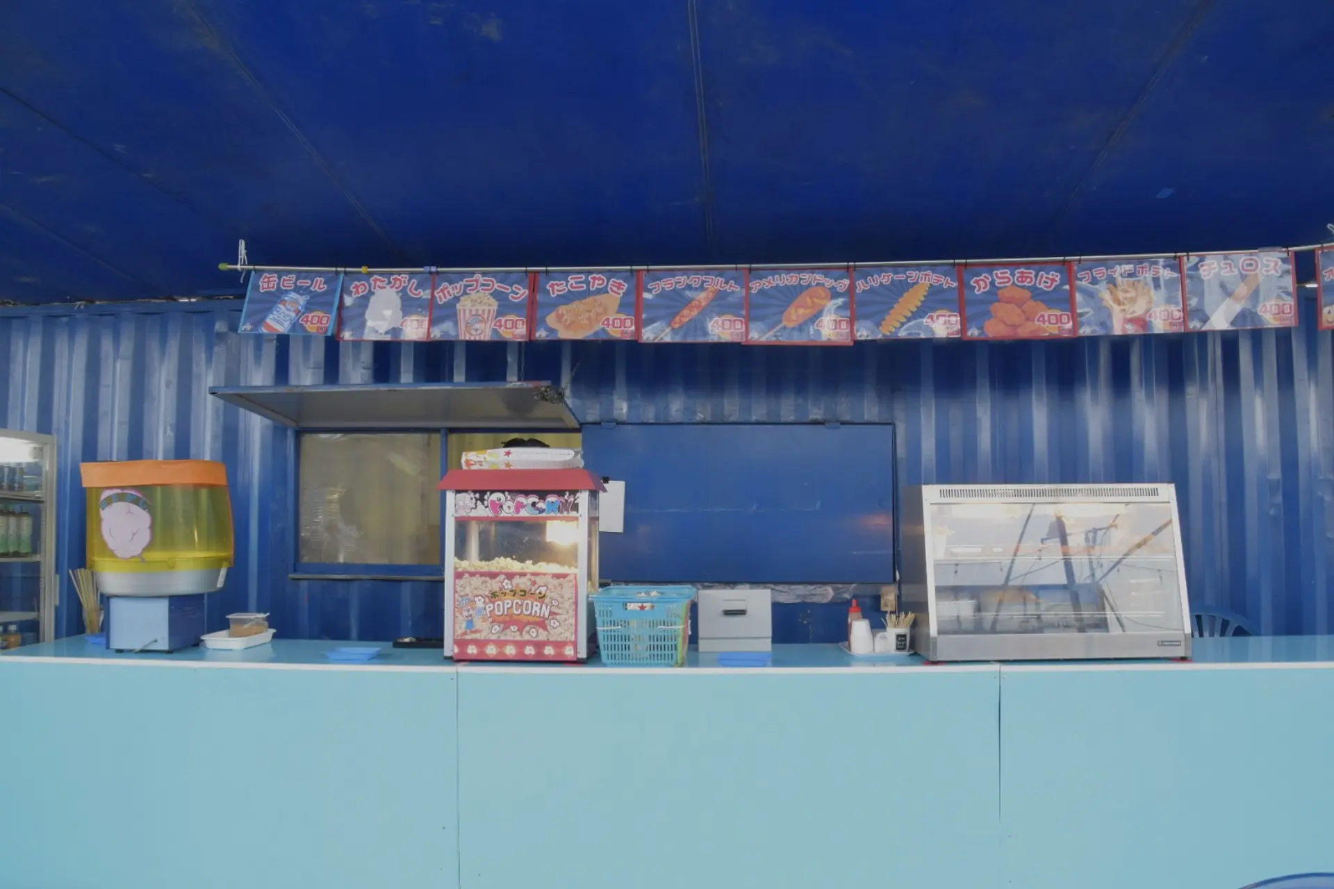 わたがし(400円)ポップコーン(400円)たこやき(400円)フランクフルト(400円)アメリカンドック(400円)ハリケーンポテト(400円)からあげ(400円)フライドポテト(400円)チュロス(400円)オニオンリング(400円)缶ビール(400円)の販売、その他ペットボトルジュースの販売がありました。(自販機もあり)
