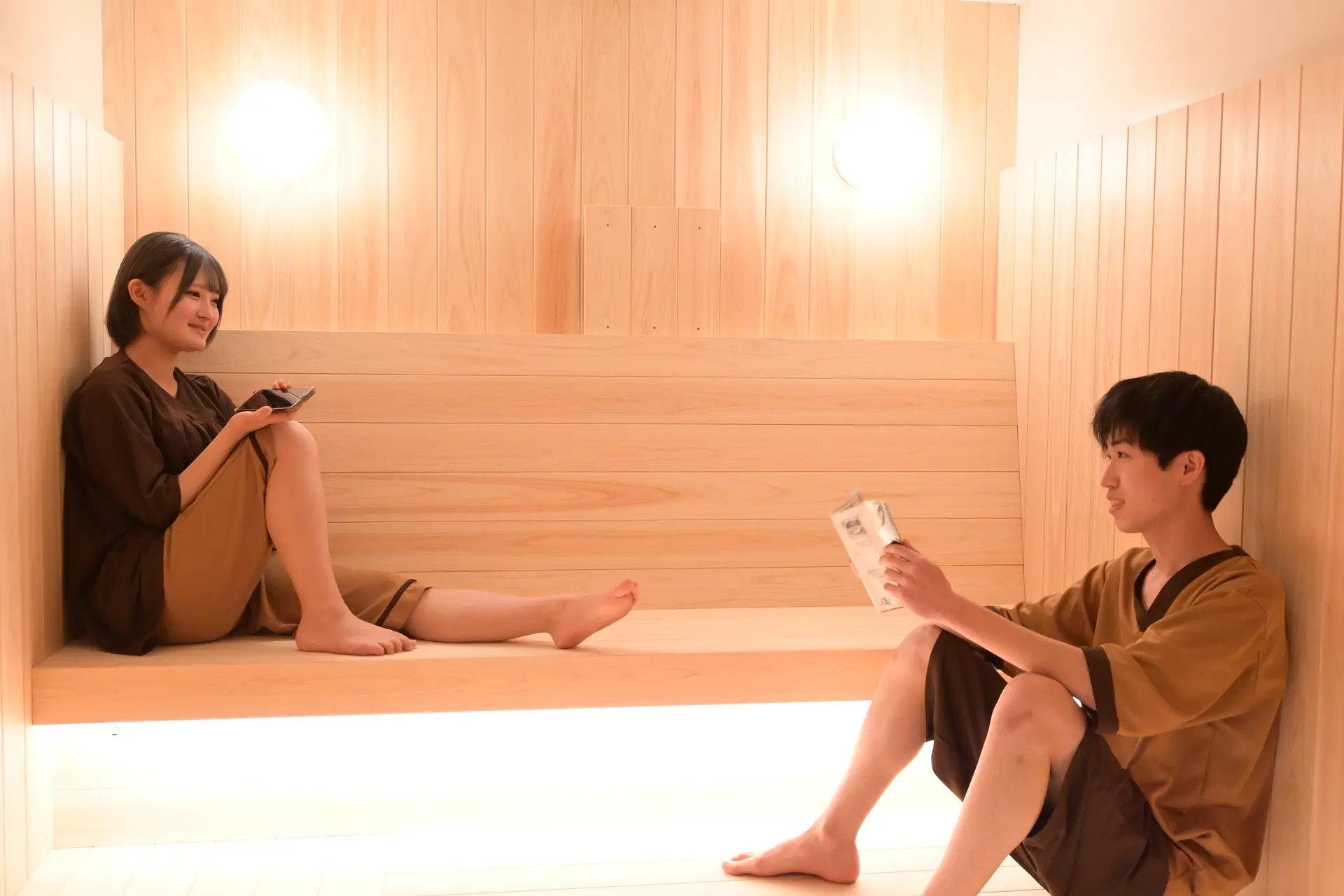ヒーリングサウナは、ブックラウンジの奥にあり、3つのサウナと、約15℃のクーリングルームがあります。館内着を着用するため、男女一緒に楽しめます。スマホ持ち込みオッケーで、ブックラウンジの漫画を持ち込んでもいい部屋も。クーリングルームではドリンクも飲めます。