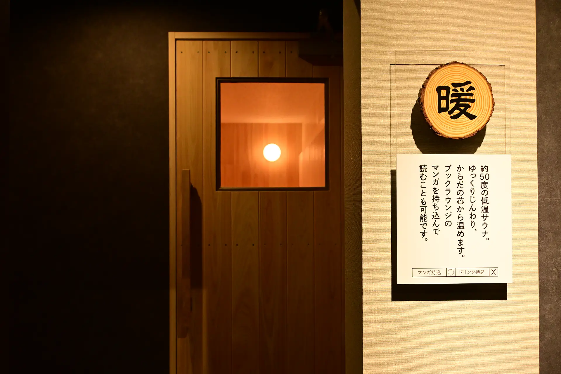 「暖」をテーマにした約50℃の低温サウナ。ゆっくりじんわり楽しめます。マンガが読めるのはこの部屋です。スマホでゲームしたり、写真を撮り加工してインスタに投稿するのも、低温のこの部屋がお勧めです。