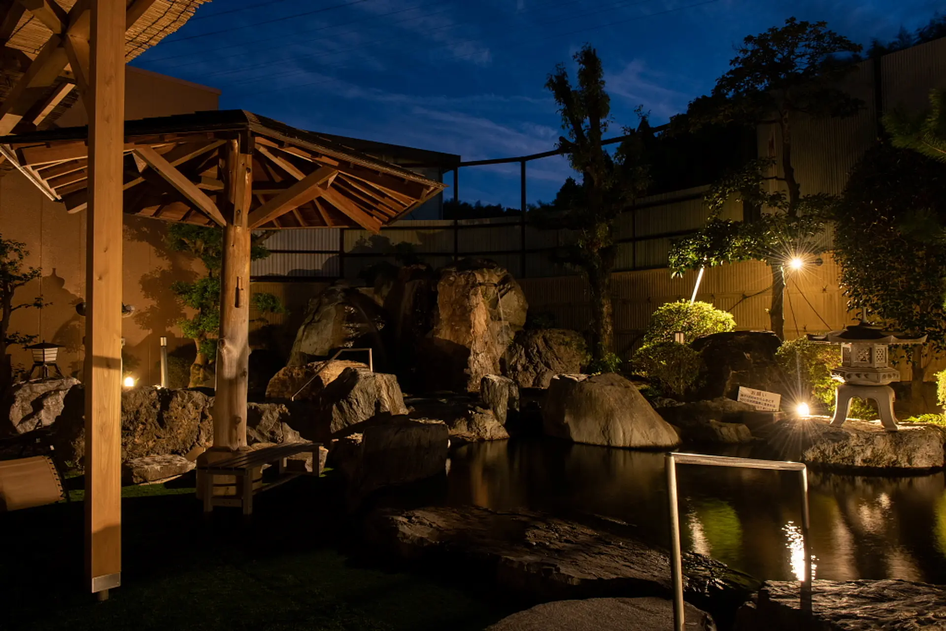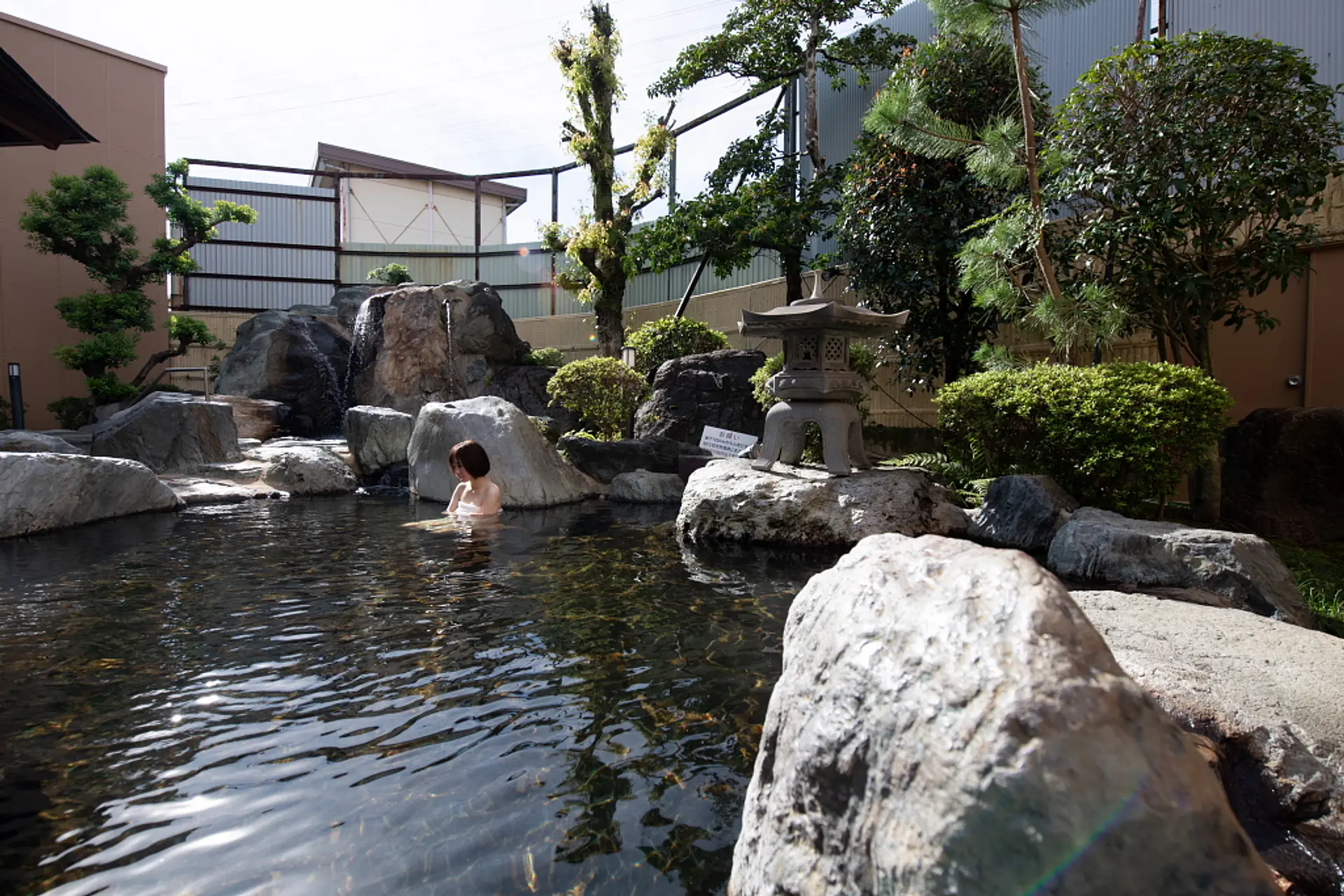 毎日湧き出し、毎日くみ上げられた新鮮な「飲める天然温泉」。大露天風呂は、かけ流しでお楽しみいただけます。泉質は体にやさしいとされる「弱アルカリ性単純温泉」です。テレビを見ながらゆっくり浸かったり、デッキチェアで休憩もできます。滝のように流れる打たせ湯も楽しめます。