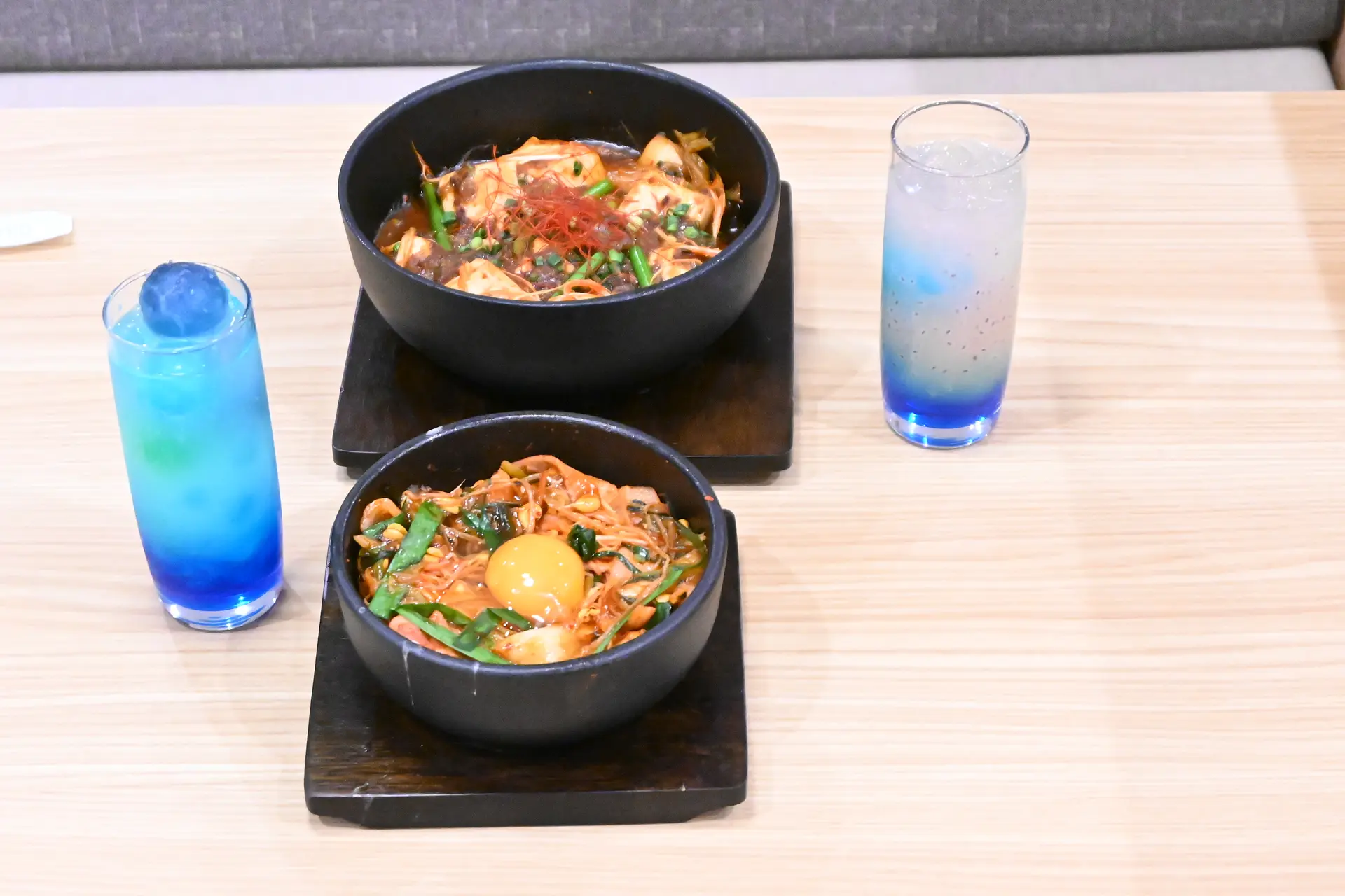 サウナドリンクと言えば「オロナミンC」で「ポカリスエット」を割った「オロポ」が有名ですが、シェフが考案したのはフルーツとノンアルコールのブルーキュラソーをブレンドしたドリンク。大人用はノンアルコールの「チャイナブルー」。ライチやグレープフルーツ、バジルシードをブレンドし、炭酸で割ることもできます。子供向けにはぶどうやカシス、苺、カルピスをブレンドしています。豚キムチや麻婆の辛さを優しく和らげてくれるドリンクです。
