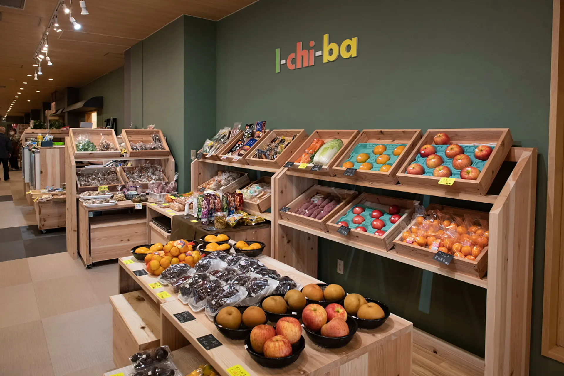 大衆演劇が上演されるレストランホールの前の廊下には、新鮮野菜やお菓子、ゆうゆう会館で育てた苺、地元の美味しい名産品などが並ぶマルシェも。レストランやブックカフェ以外にもちょっとお腹が空いた時に食べられるものや、お家で食べるお土産も買えます。