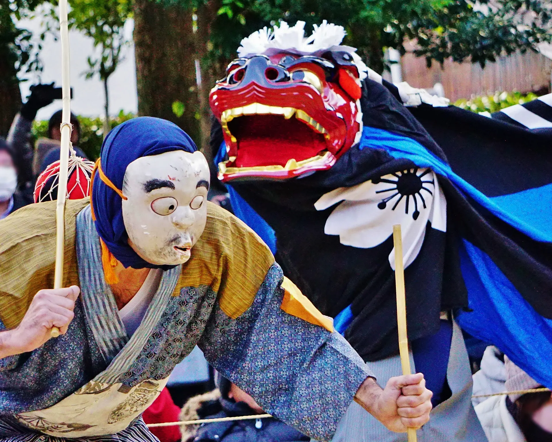 | 撮影者コメント | 桑名市増田神社の伊勢太神楽です。 毎年、12月24日に旅先から桑名に戻り太神楽を披露します。 獅子舞と道化役のやり取りの一コマです。 ユーモアがあり見ていて楽しいです。 |