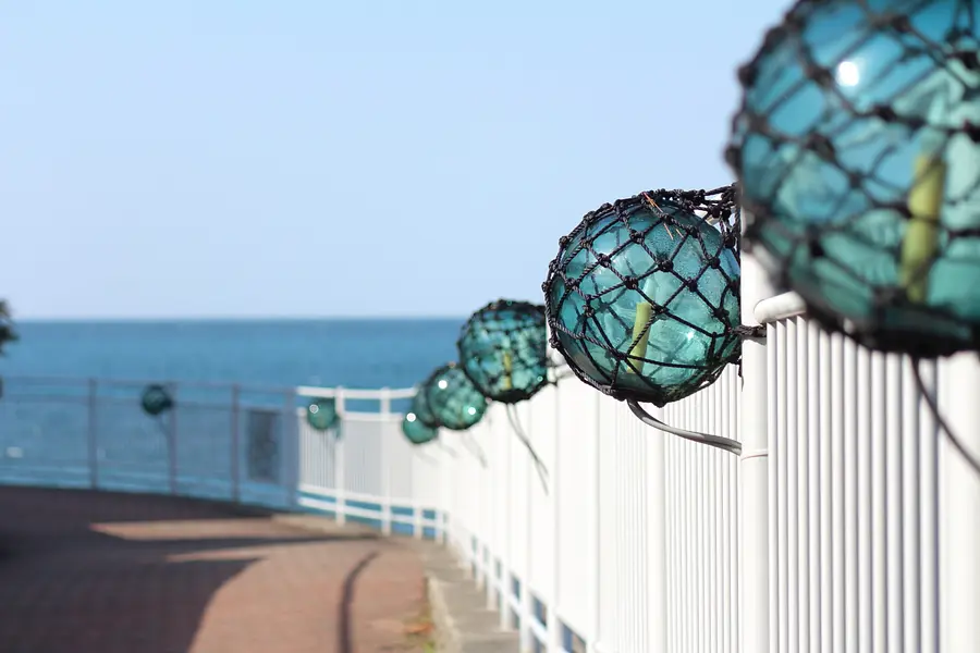 ビン玉のオブジェが飾られた風情ある散歩道。大矢浜海水浴場から続く海岸沿いの散策道で約1kmに渡って続きます。