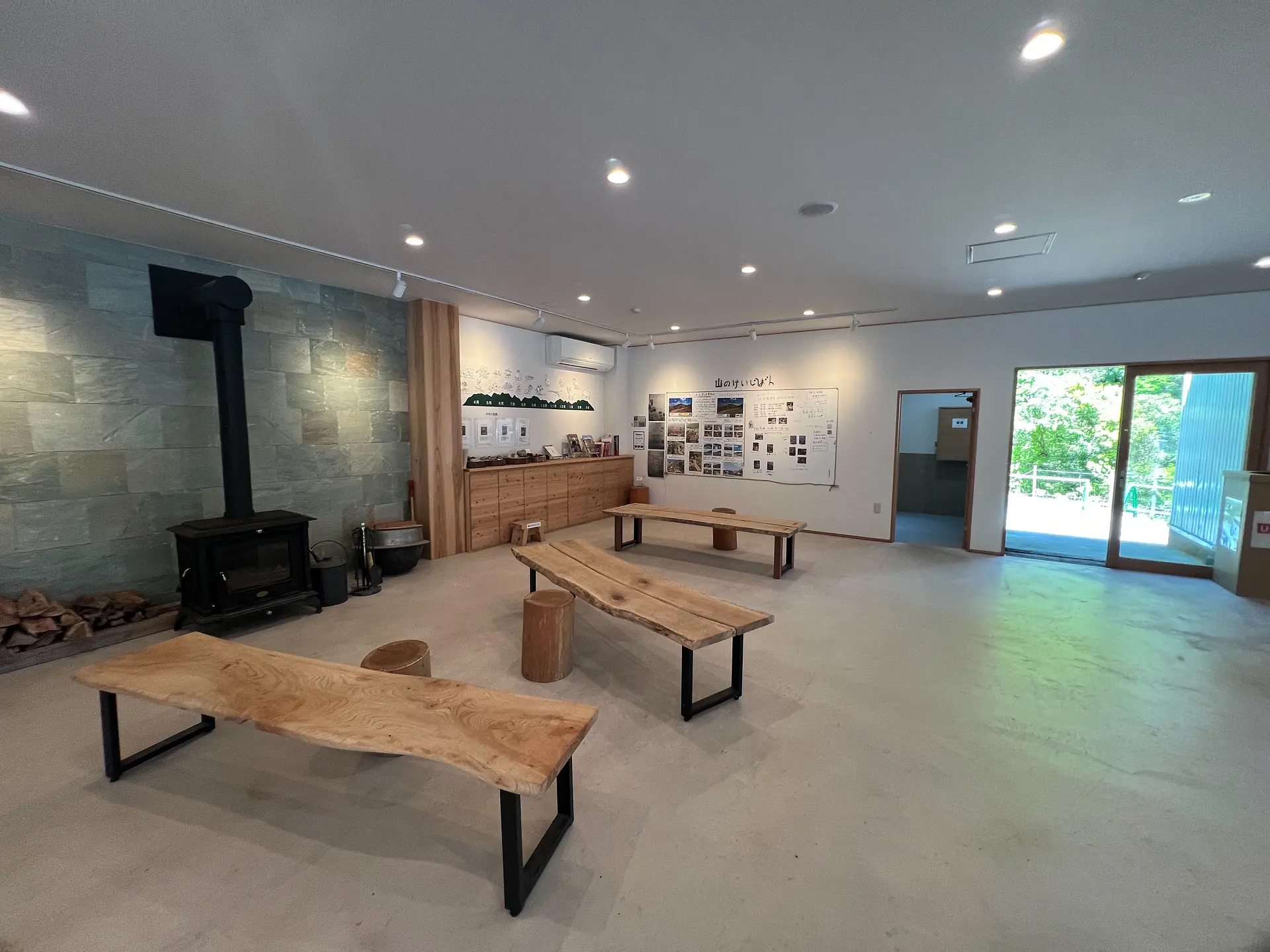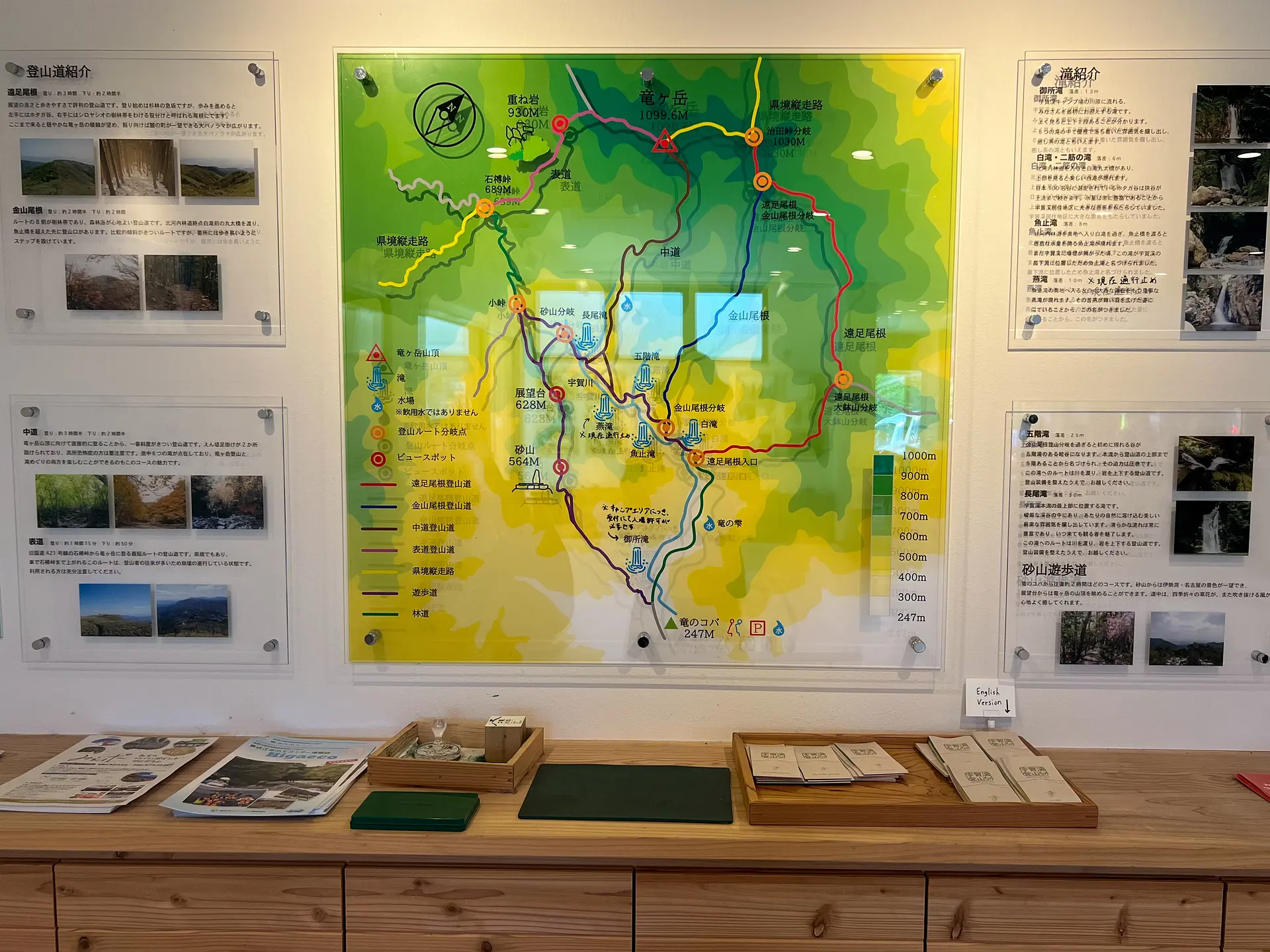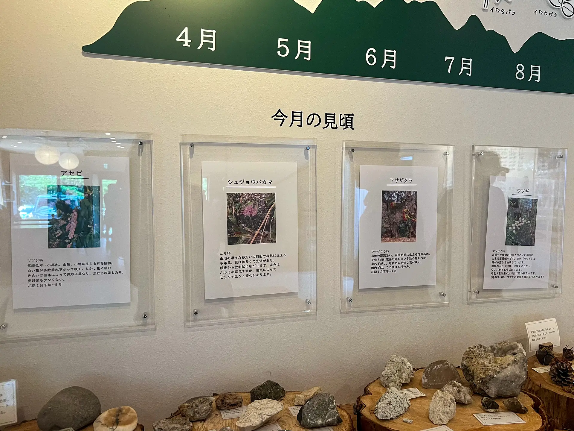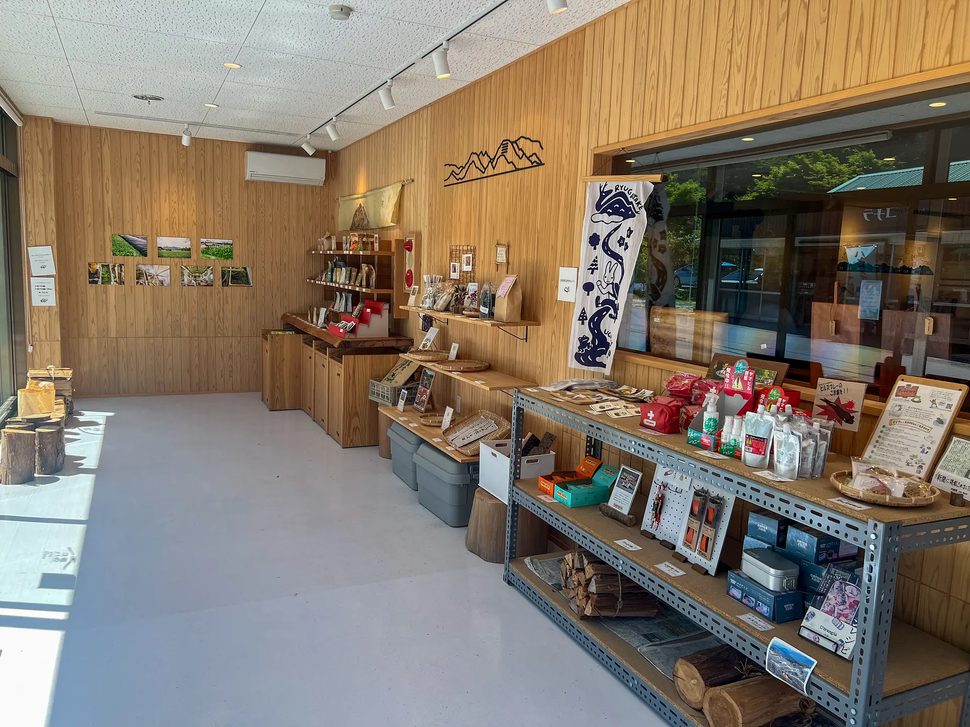 施設内には、トイレ・休憩スペースのほかカフェも併設されています。 休憩スペースでは、宇賀渓の自然スポット情報や登山情報、登山道で見頃となっている花の情報を知ることができます。