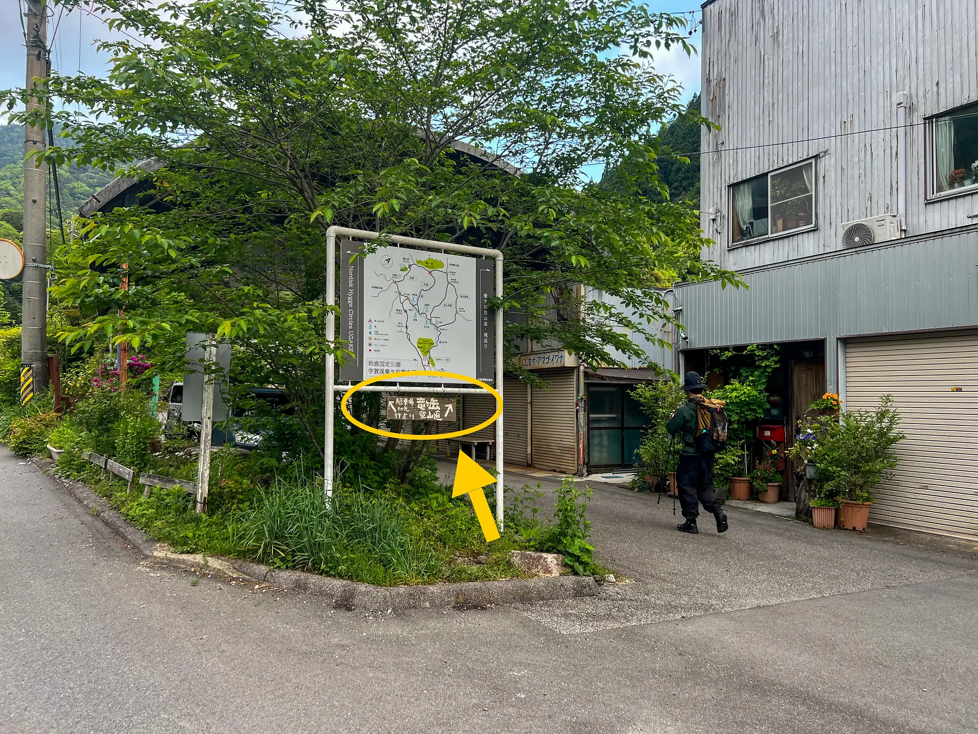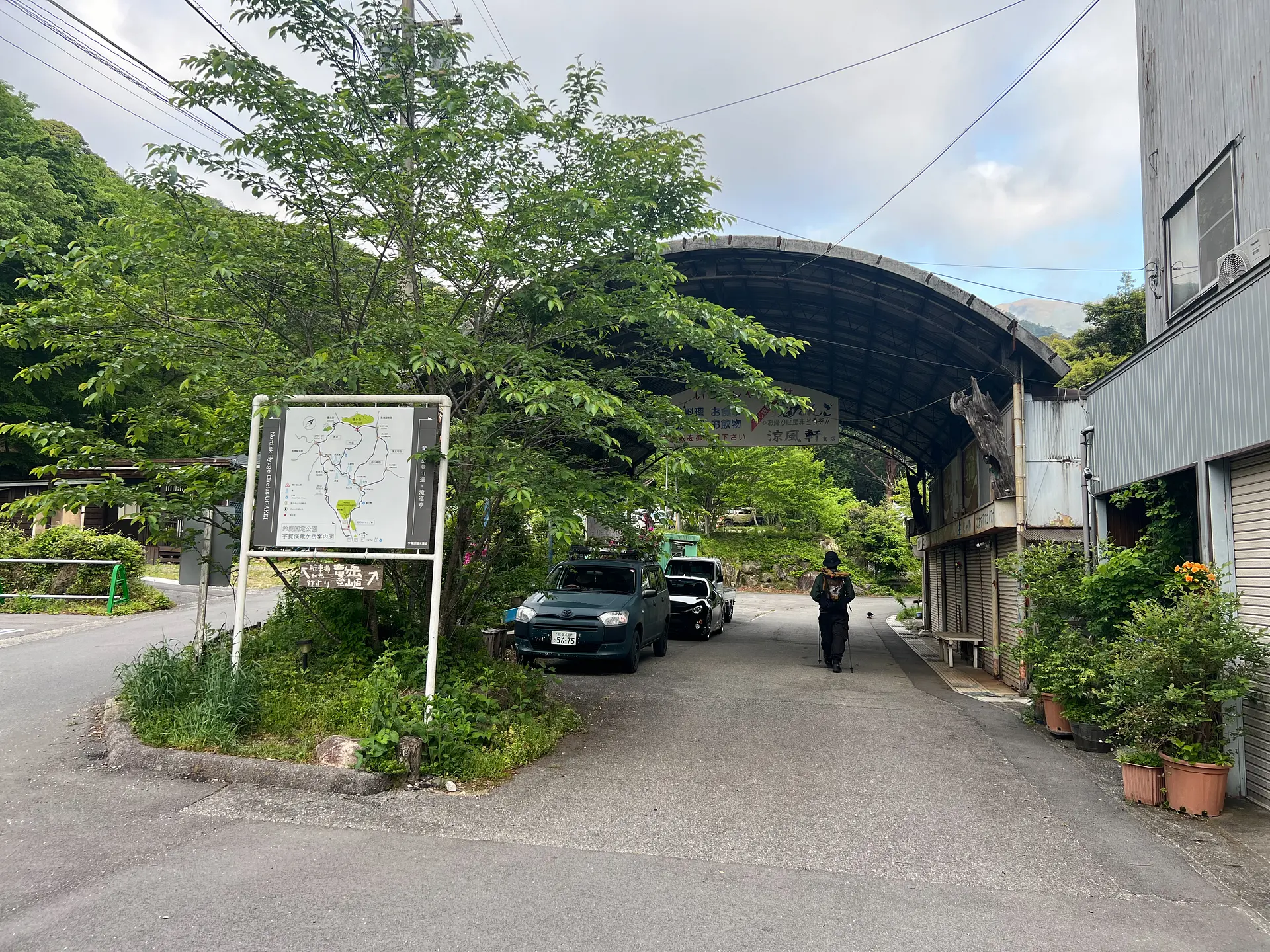 アーチ状の建物方向に進んでいきましょう。案内看板の下にも竜ヶ岳登山道の案内がありますので、案内の方向の通り道を進みます。