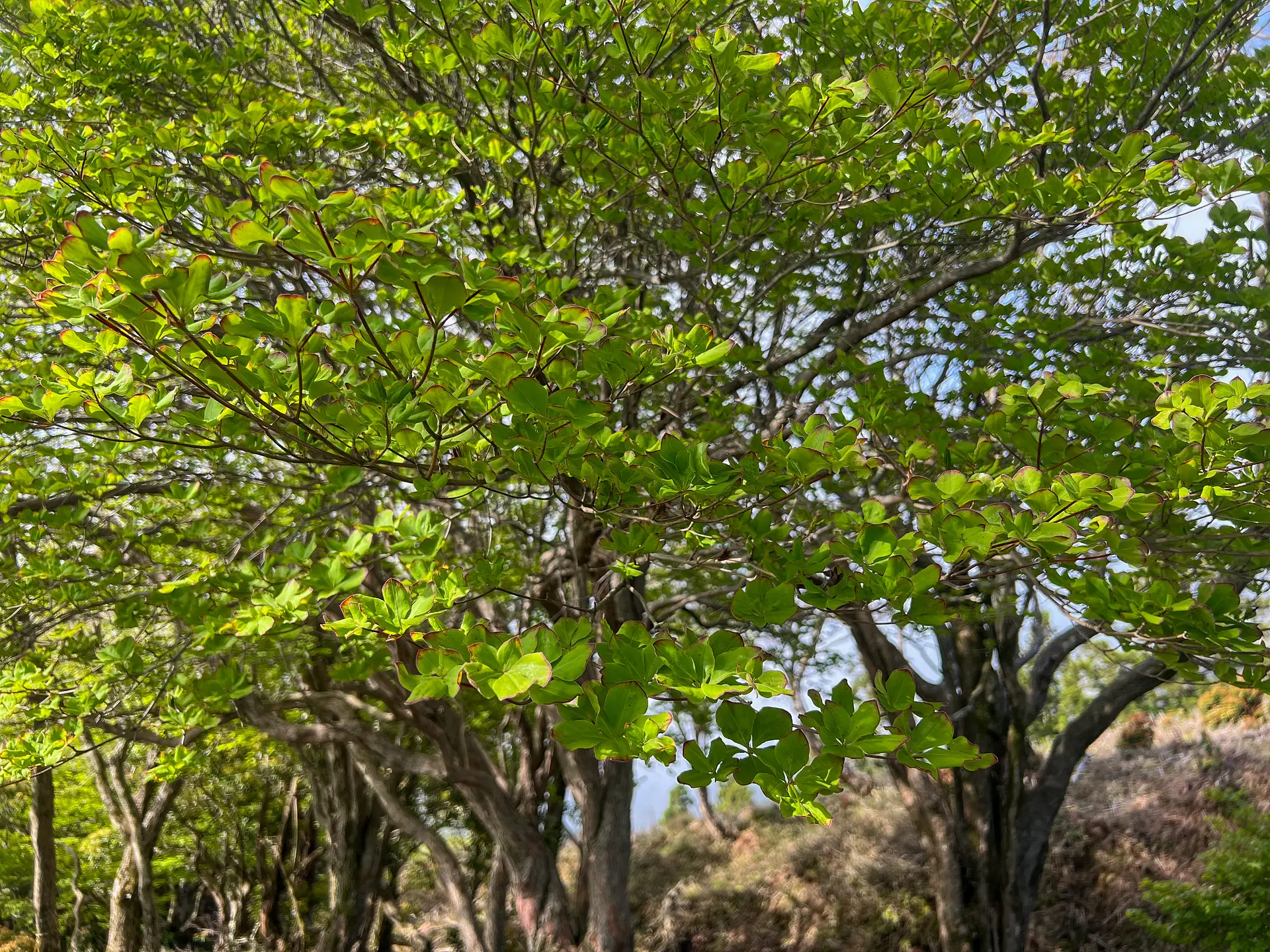 ここからは、展望の良い尾根伝いに歩いていきます。緩やかな登り降りをくり返しながら、パッと通りすがりの木を見たら、シロヤシオの木が!!(しかし、ここには咲いていませんでした、、、)